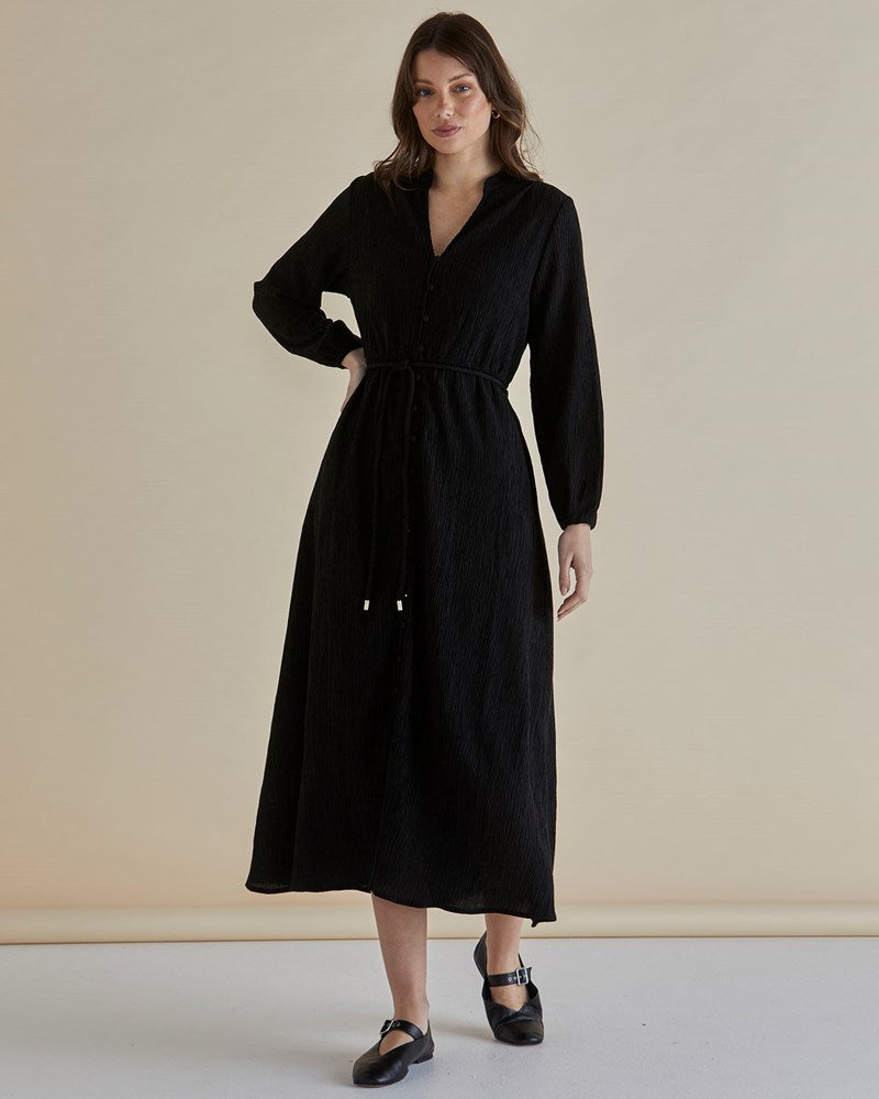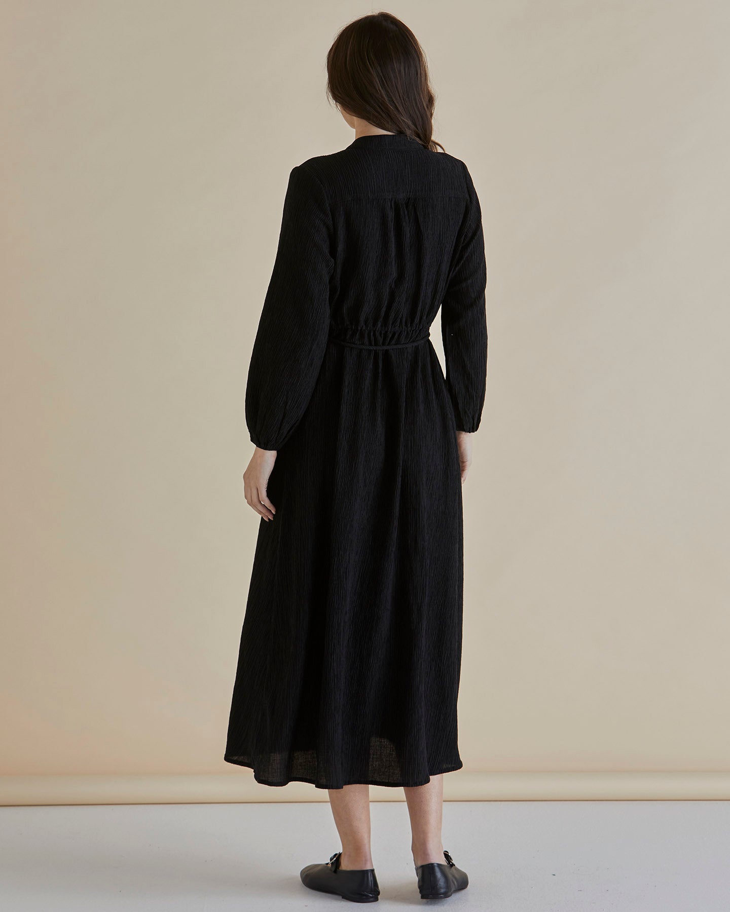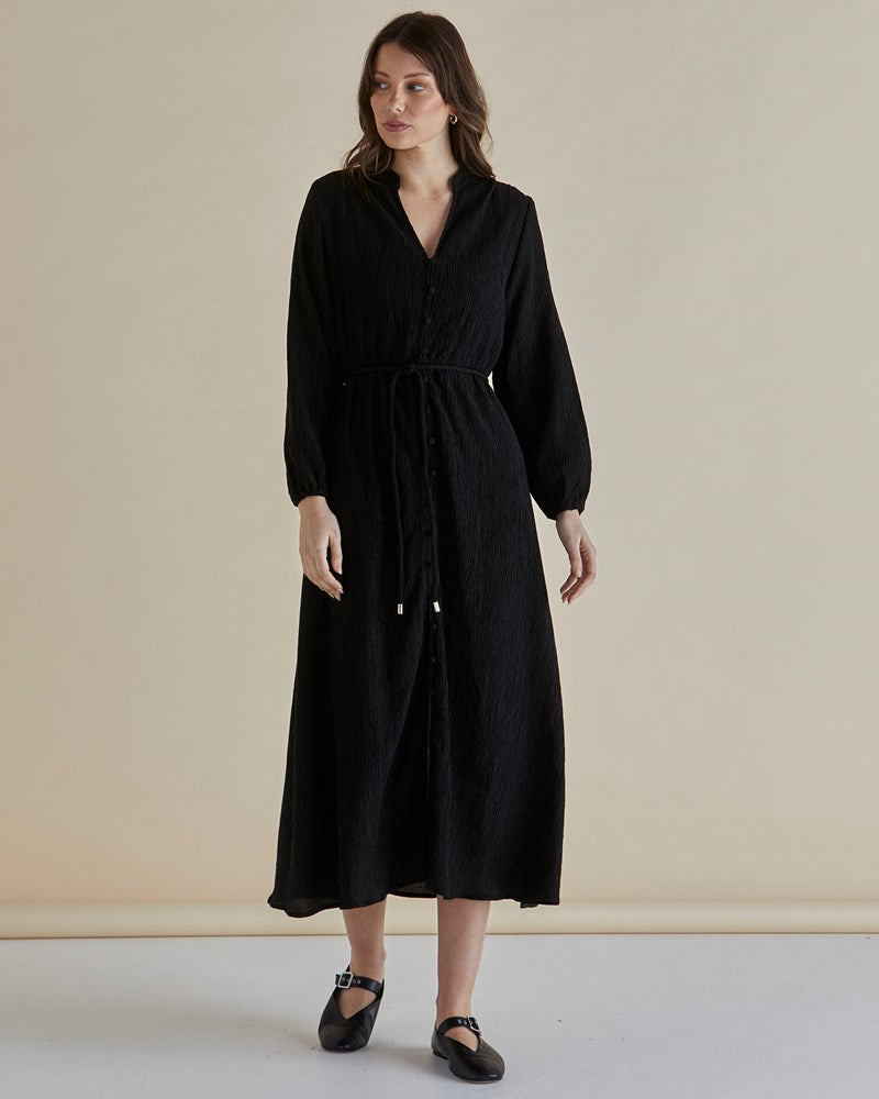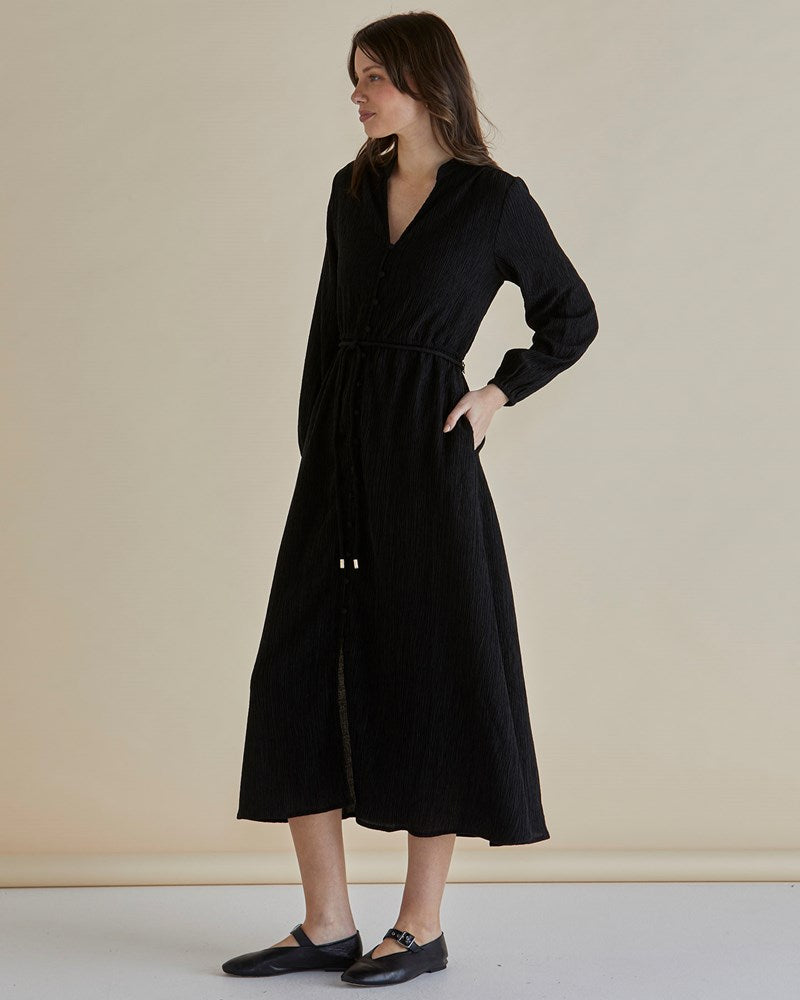 The Anette Dress is a soft crinkle fabric piece that combines comfort and style. With its button-up front, elasticated waist with self-fabric tie, and elasticated cuffs, this dress provides an effortlessly chic, relaxed fit perfect for every season.