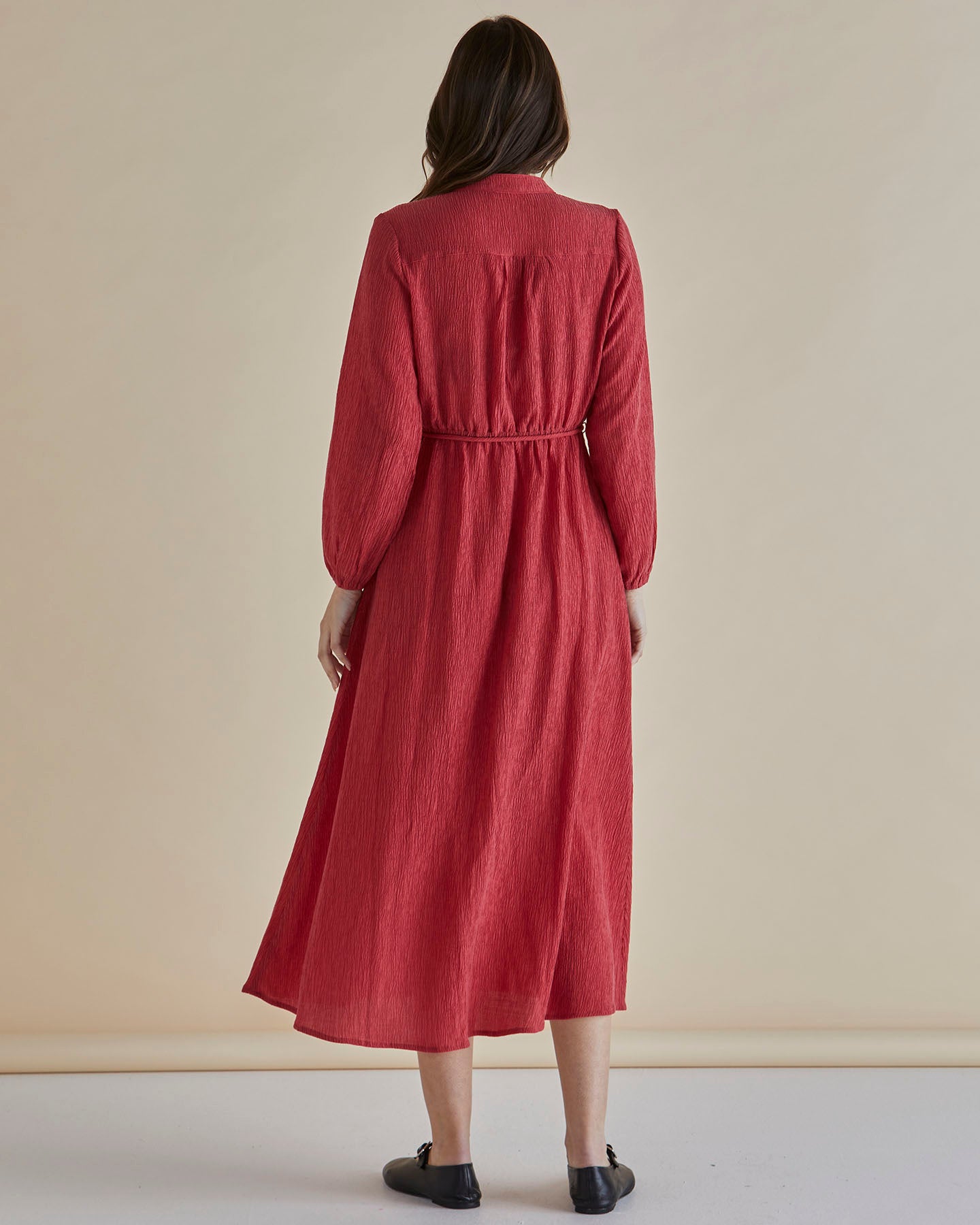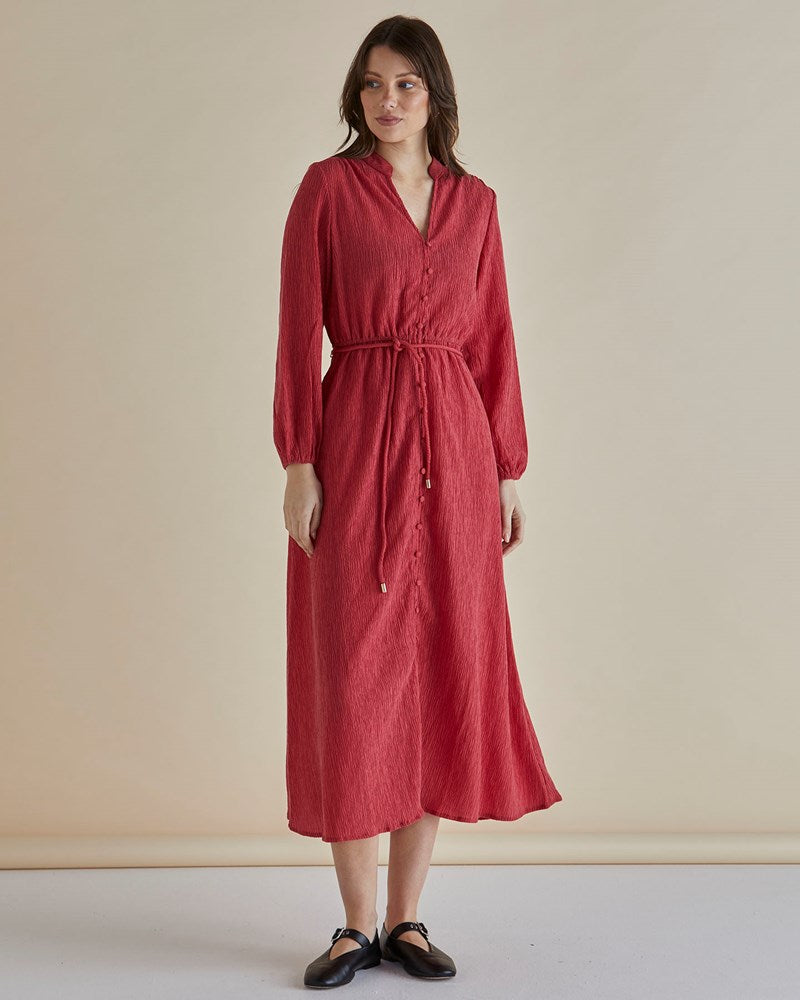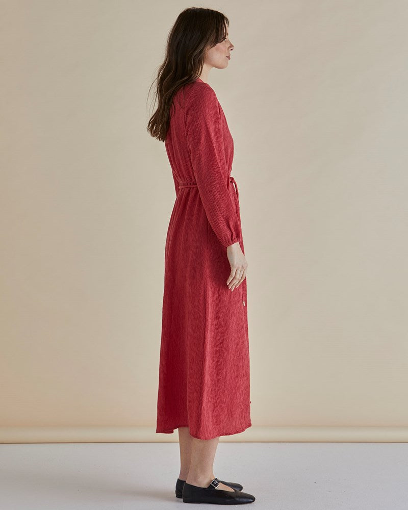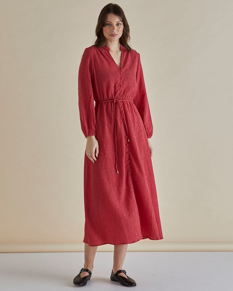 The Anette Dress is a soft crinkle fabric piece that combines comfort and style. With its button-up front, elasticated waist with self-fabric tie, and elasticated cuffs, this dress provides an effortlessly chic, relaxed fit perfect for every season.