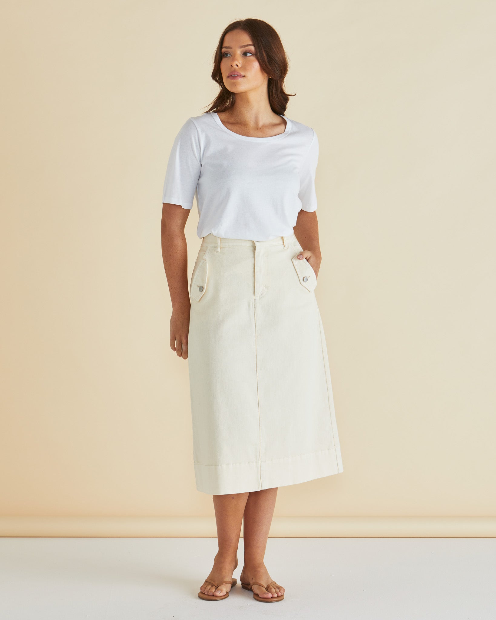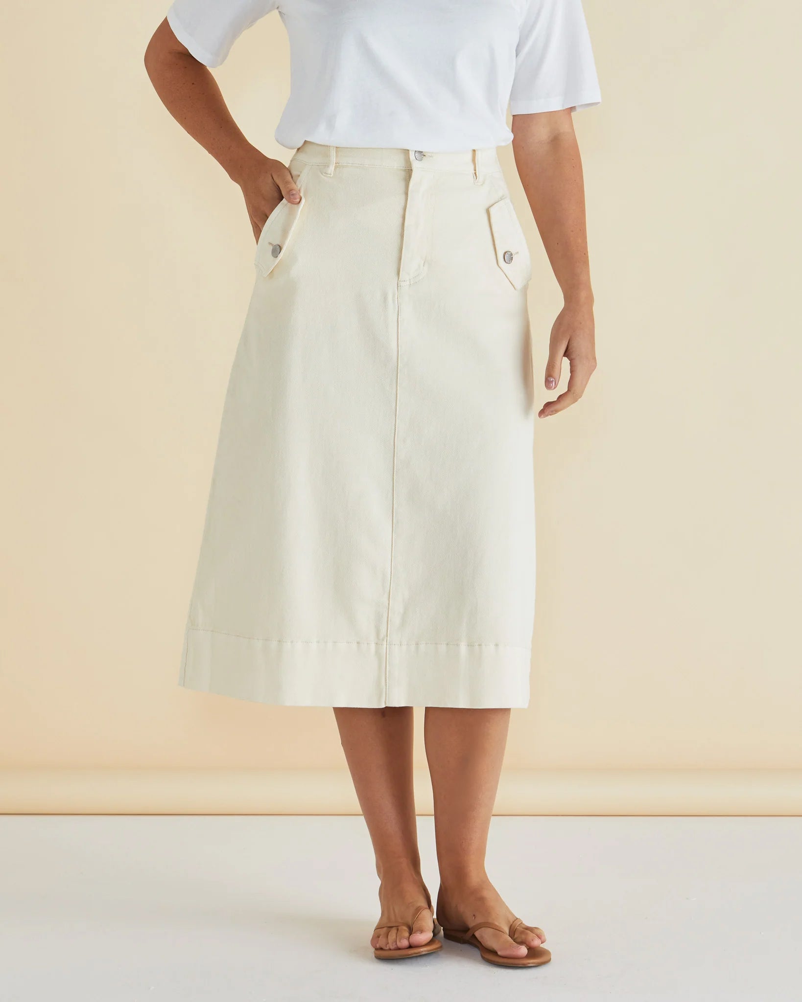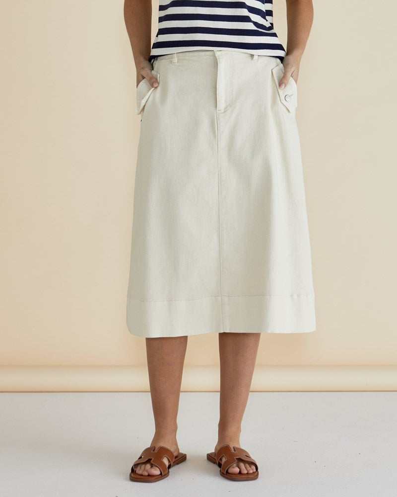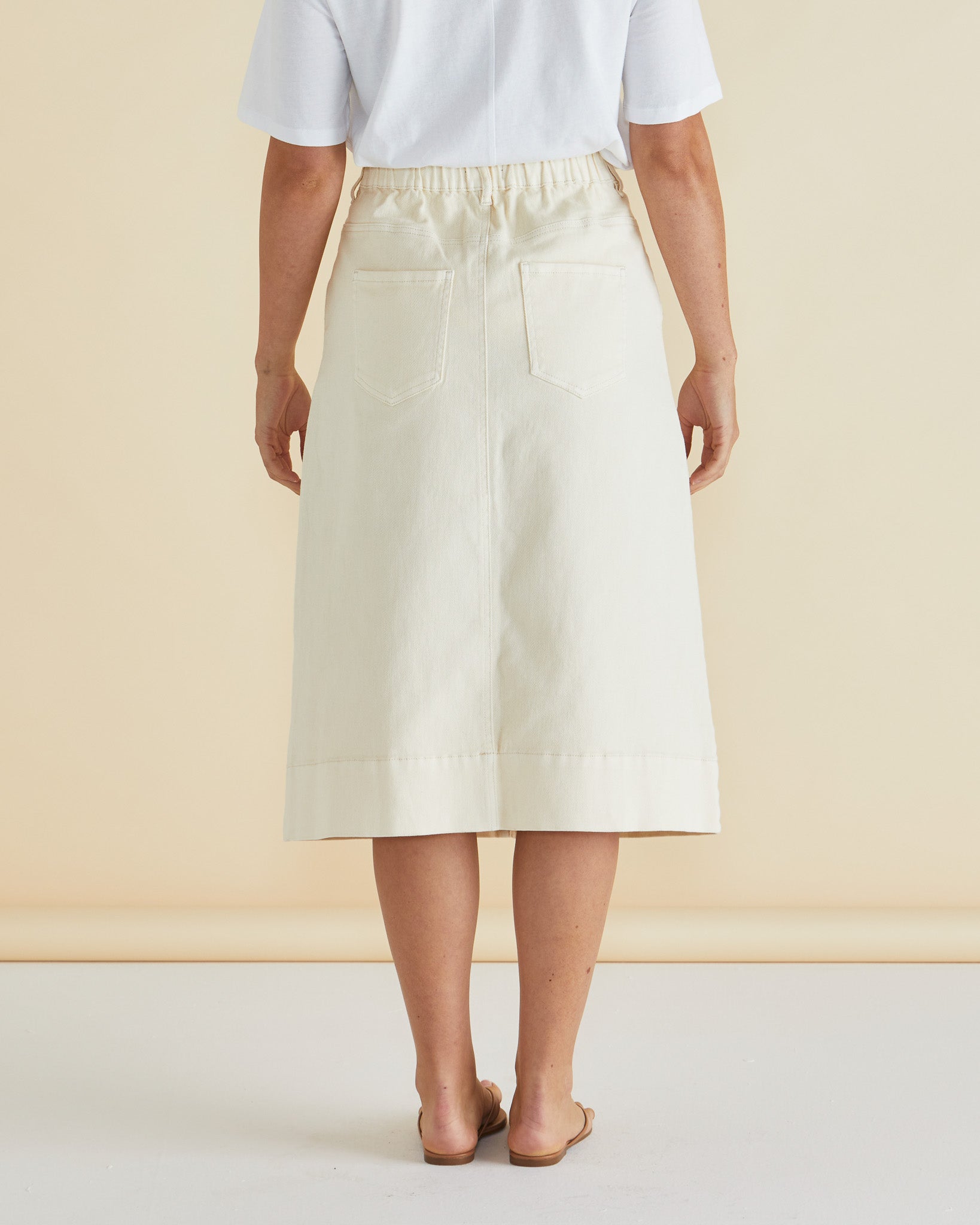 With its elasticated back waistband and midi length, the Astra Denim Skirt delivers a comfortable yet polished style. The button and zip fly front make it a timeless addition to your wardrobe, perfect for effortless autumnal dressing.