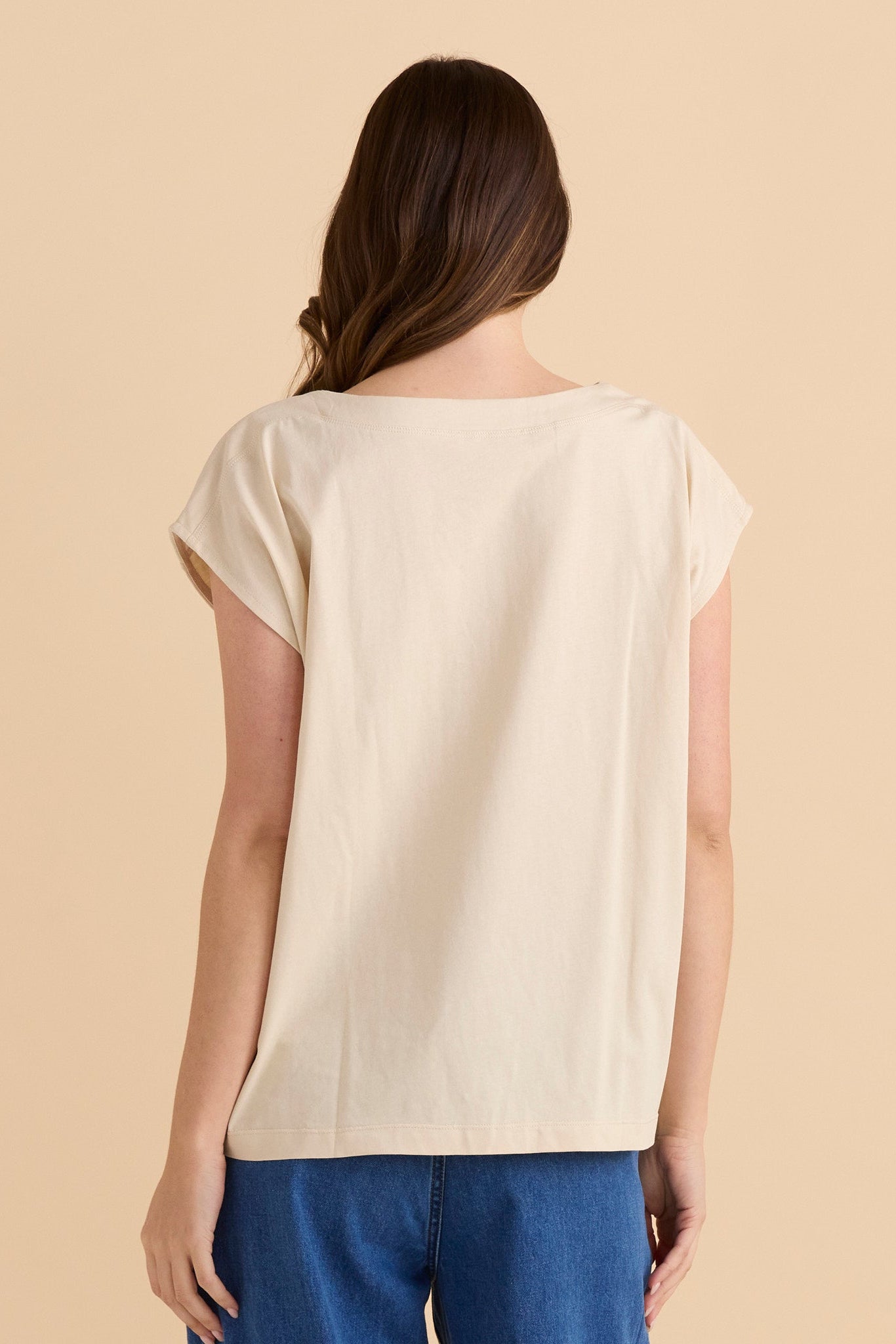 A lightweight jersey top with a flattering boat neckline. Cap sleeves create a polished yet relaxed look. Comfortable and easy to style for everyday wear. A classic staple with elevated simplicity.