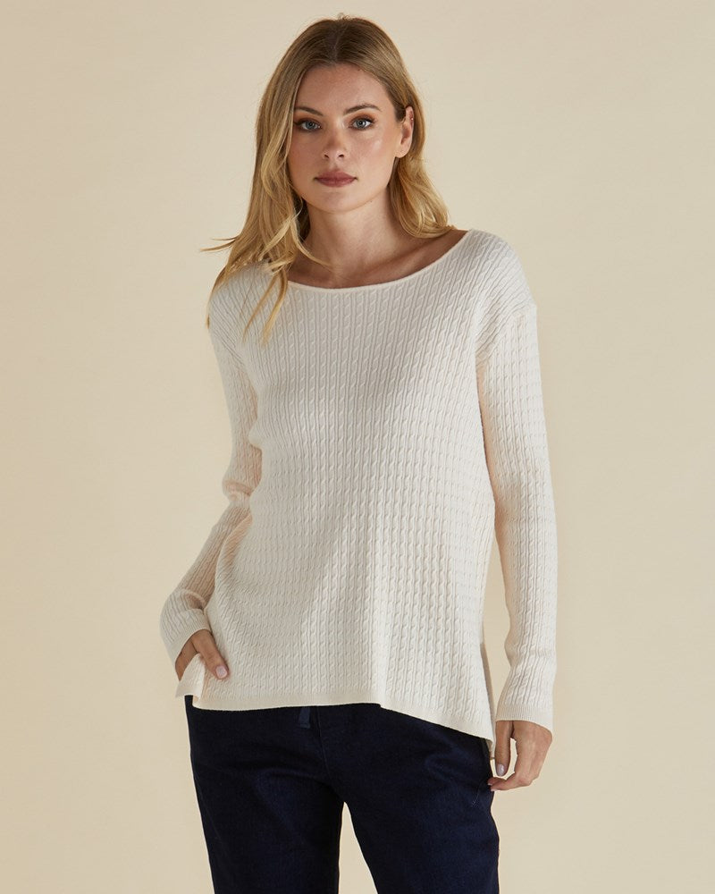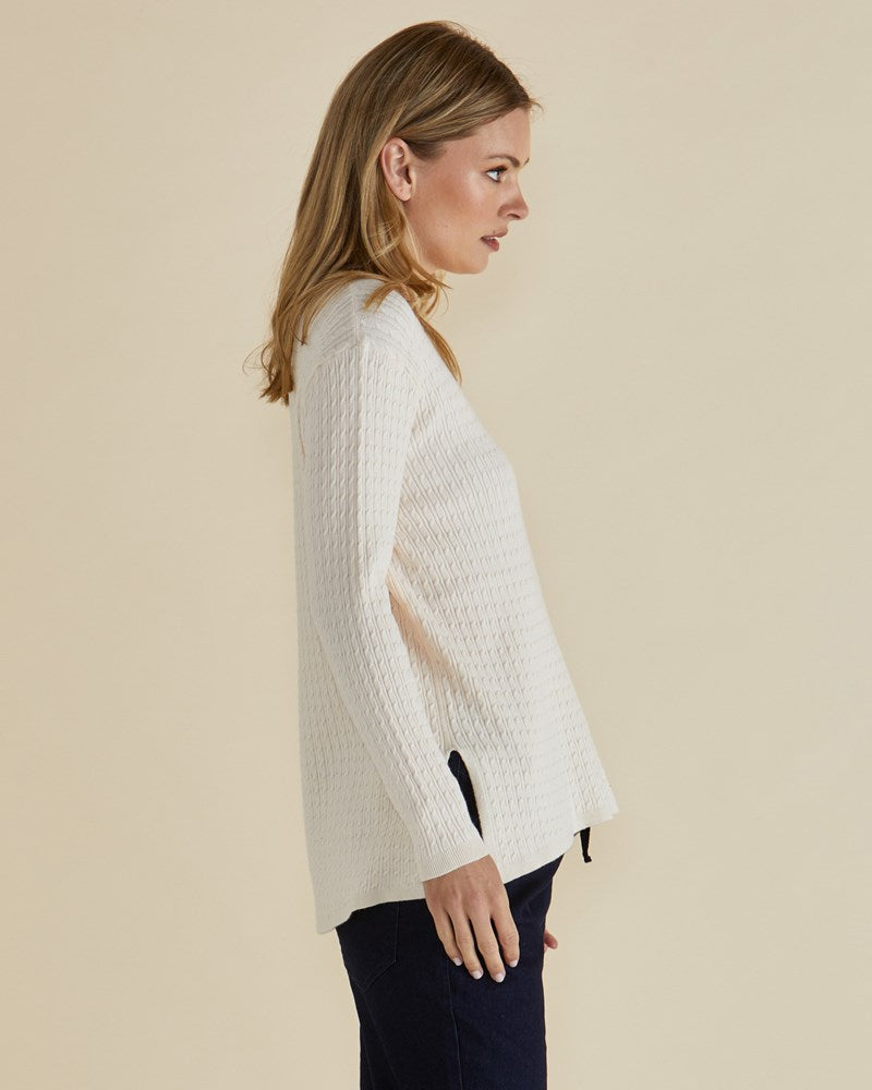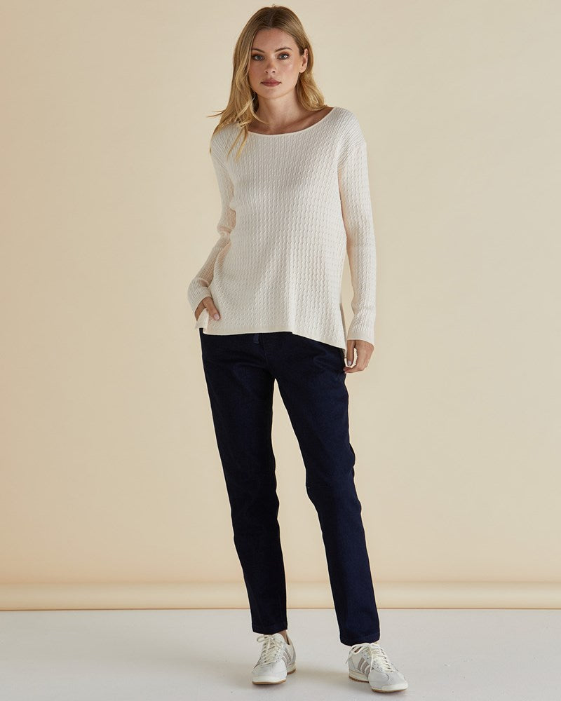 With its soft stretch knit texture and relaxed fit, the Cable Mini Jumper is designed for comfort and effortless style. The high scoop neck and drop shoulder sleeves create a laid-back look, while the high-low hem with side splits adds a contemporary touch. Perfect for layering over your favourite jeans or leggings, this jumper keeps you cozy and chic all day long.