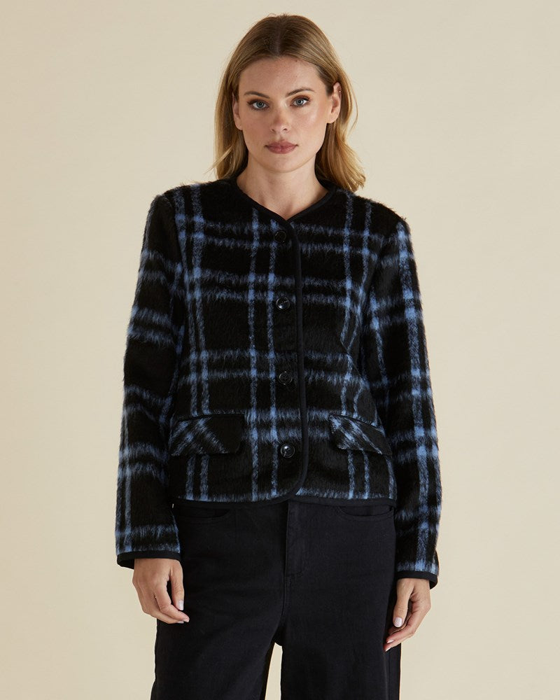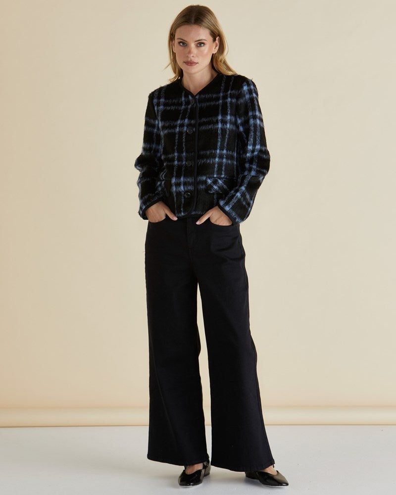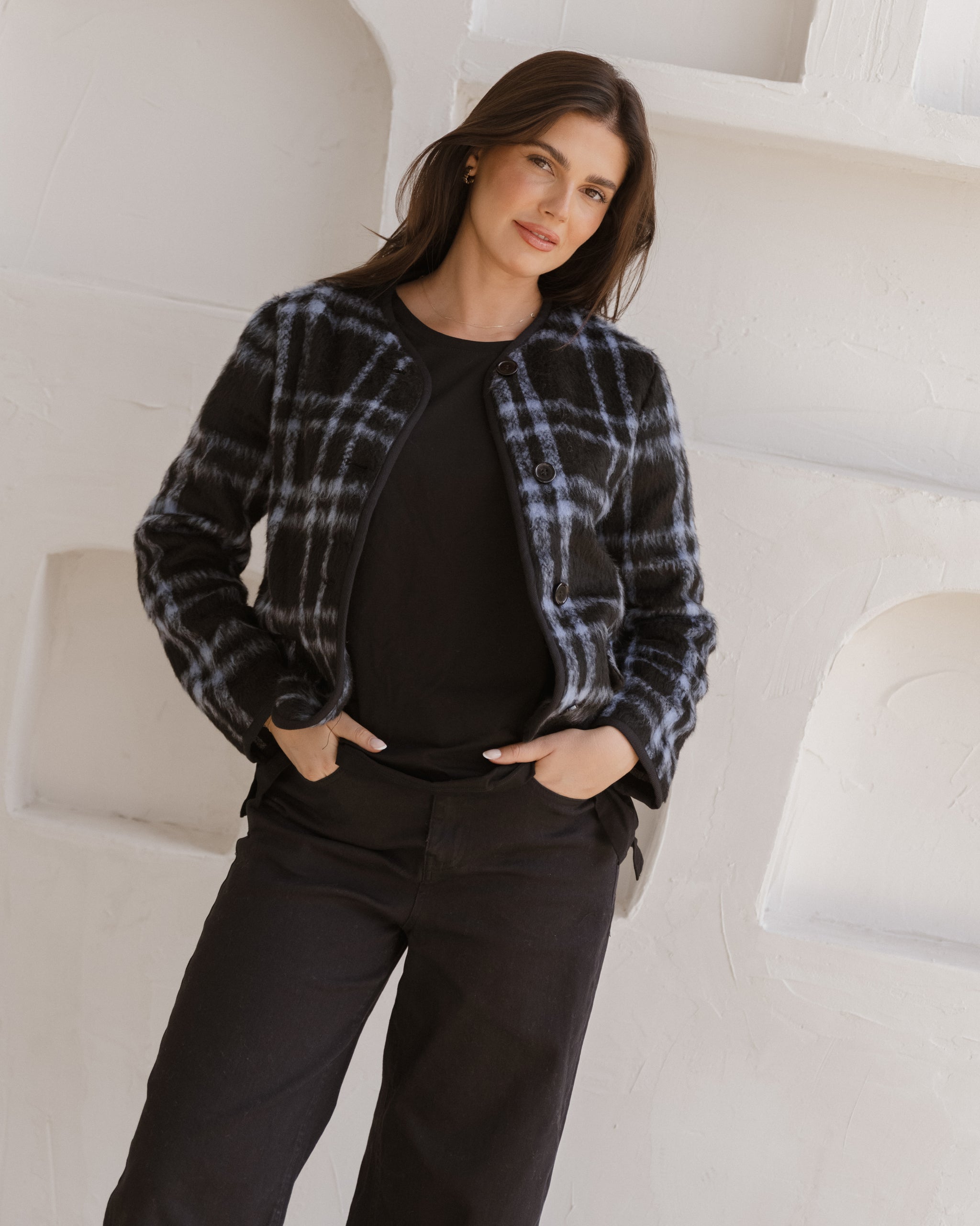 The Charlie Check Jacket is a chic and stylish option for layering over any outfit. Featuring a button-up front and long sleeves, this cropped jacket offers a relaxed fit. The flap pockets add functionality, while the check pattern brings a bold, modern touch to your wardrobe. Whether paired with jeans or skirts, the Charlie Check Jacket is perfect for adding a layer of sophistication to your look.