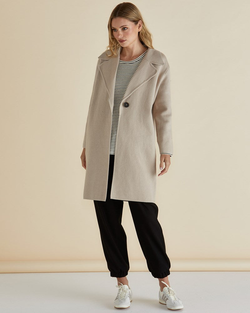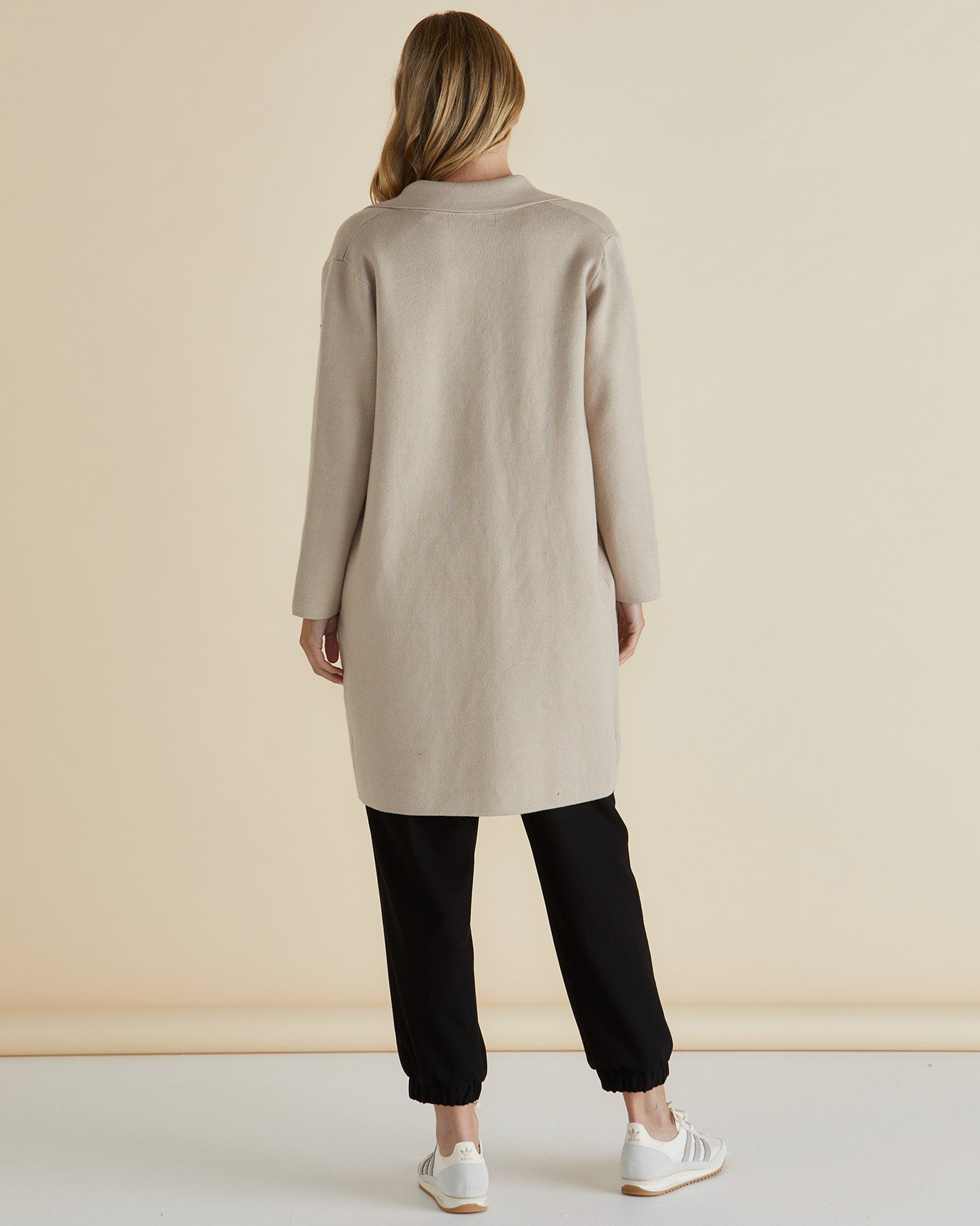 The Cosette Coatigan offers a perfect balance of cozy and chic. Made from soft stretch knit fabric, it features classic collar and lapels for a polished look. The welt pockets and self-fabric belt add functional details, while the relaxed fit ensures maximum comfort. Ideal for layering over your favourite outfits, the Cosette Coatigan brings effortless style and warmth to your wardrobe.