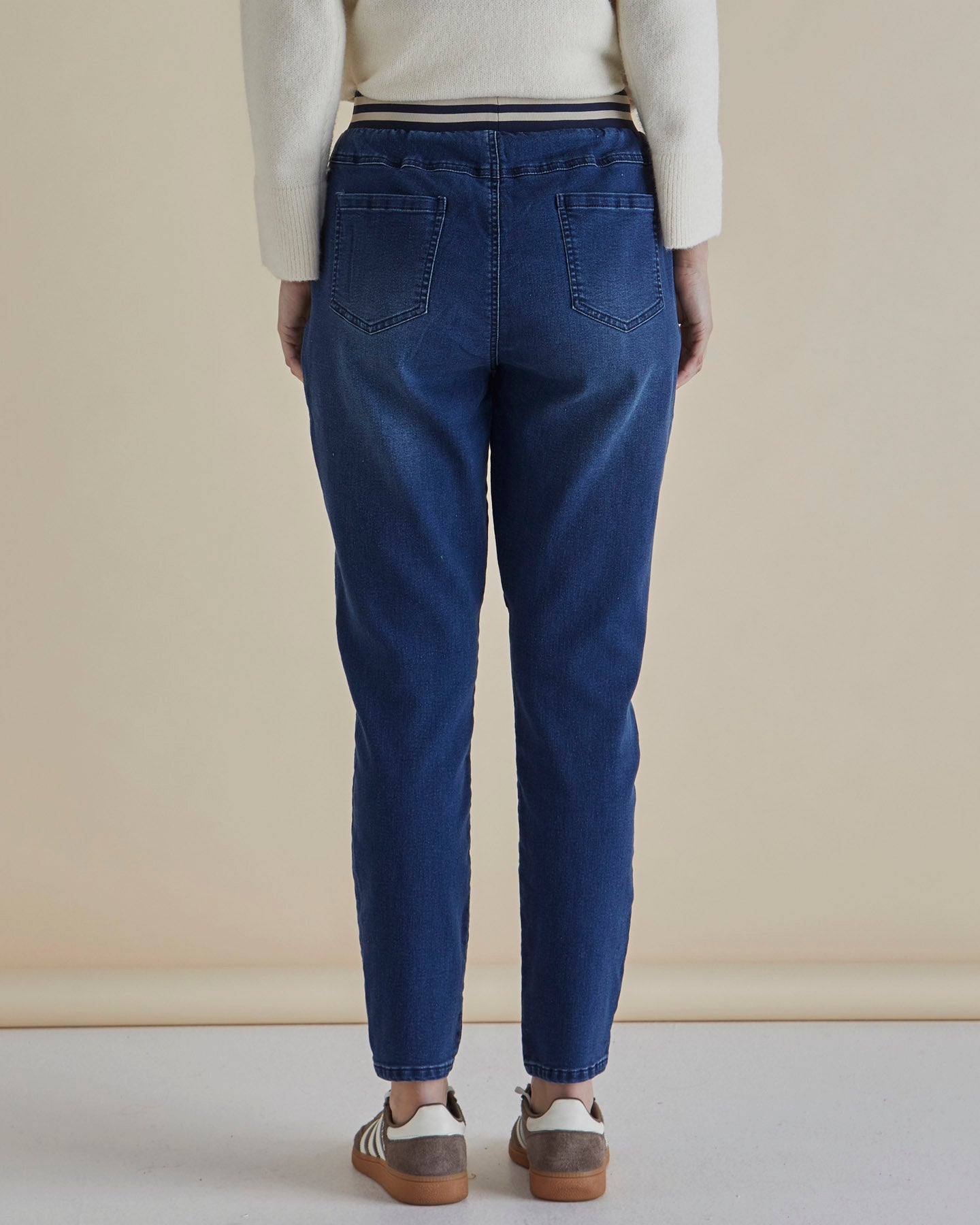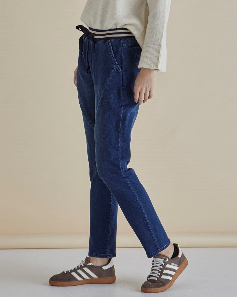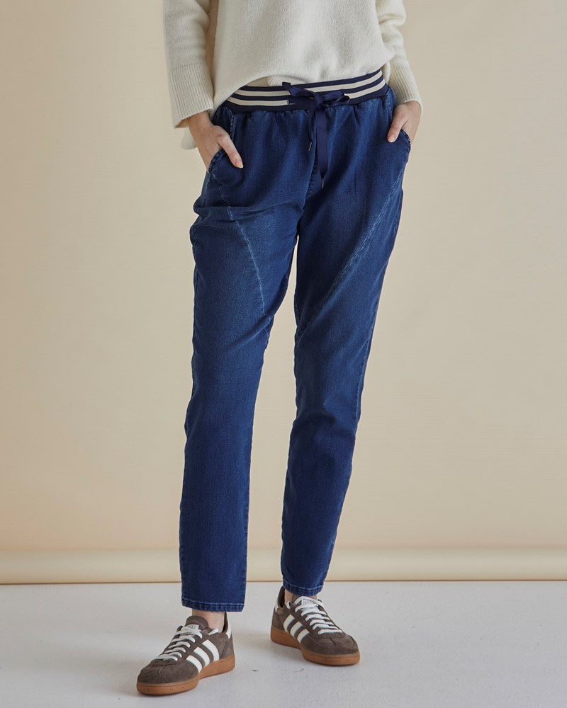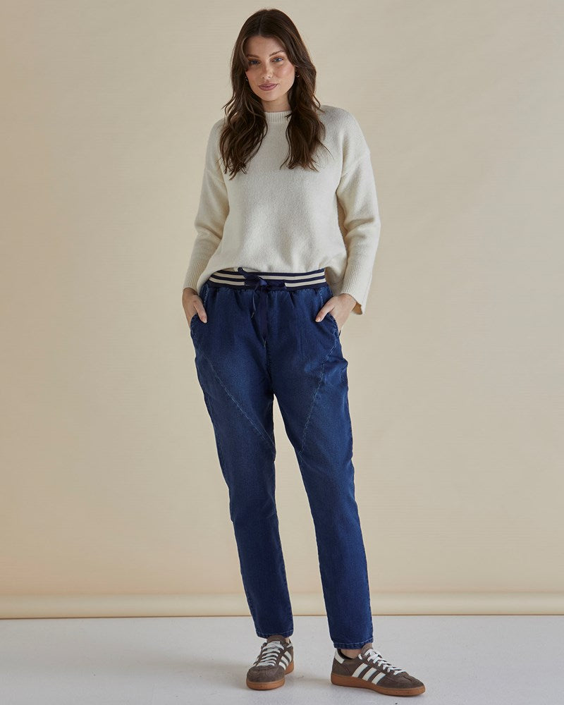 The Dakota Jean is designed with a soft denim feel and a relaxed, tapered leg. Featuring an elasticated waistband and pockets, these jeans offer a casual yet elevated fit, perfect for pairing with tees or blouses for an effortless, laid-back look with a touch of elegance.