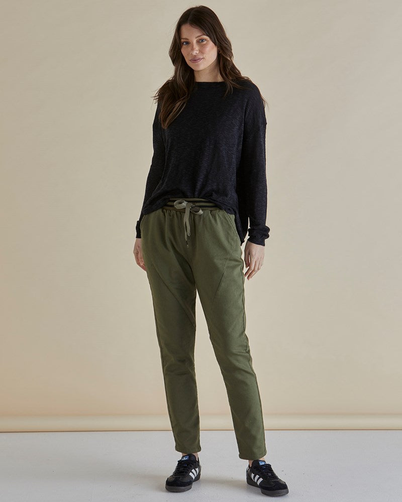 The Dakota Jean is designed with a soft denim feel and a relaxed, tapered leg. Featuring an elasticated waistband and pockets, these jeans offer a casual yet elevated fit, perfect for pairing with tees or blouses for an effortless, laid-back look with a touch of elegance.