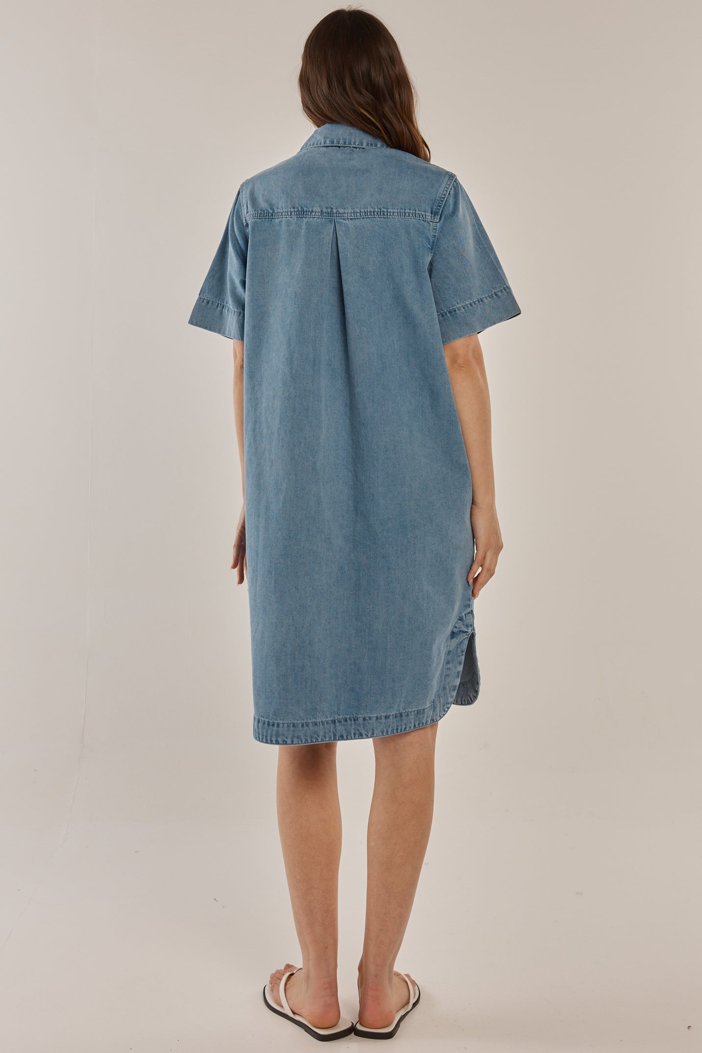 The Dawson Denim Dress offers a sophisticated take on casual dressing with its classic collar and button-up front. Made from comfortable denim feel fabric, it features side patch pockets and a relaxed fit for easy wear. The curved front and back hem add an elevated detail to this transeasonal essential. Classic, comfortable, and effortlessly chic.