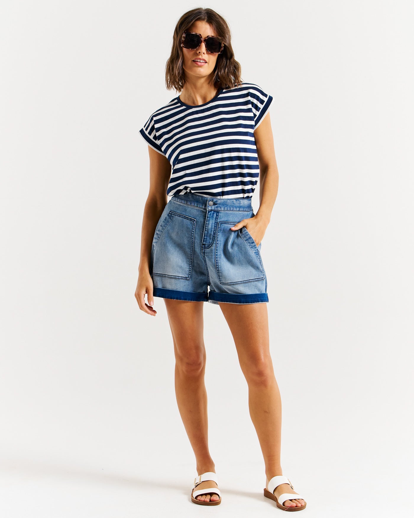 The Eddie Short combines the soft feel of knit denim with a mid-high rise fit for added comfort. Featuring an elasticated back waistband and a fly front, these shorts offer a polished look with an effortless feel.