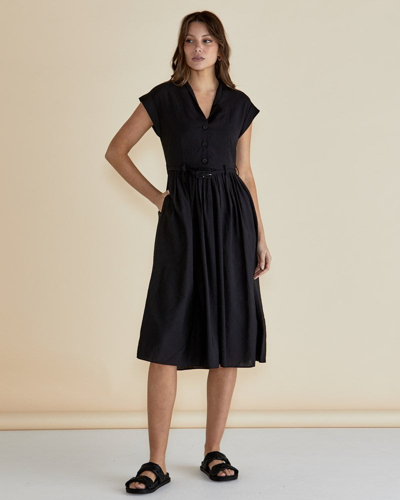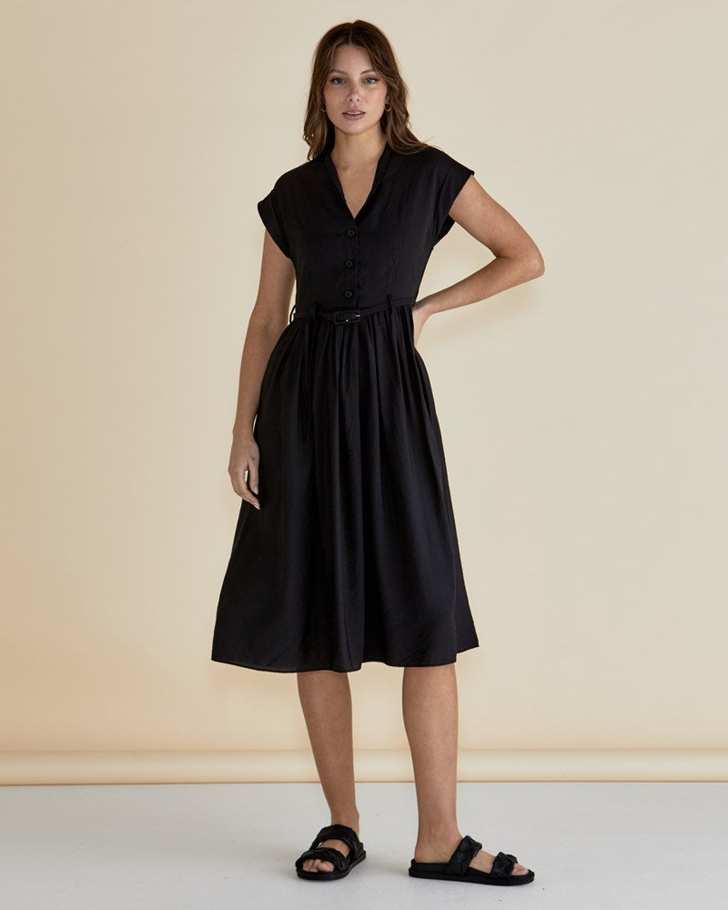 With its cuffed sleeves and self-fabric belt, the Elianna Dress offers a flattering silhouette with a button-up front. Effortlessly chic and relaxed, it?s perfect for any occasion.