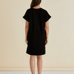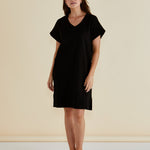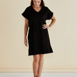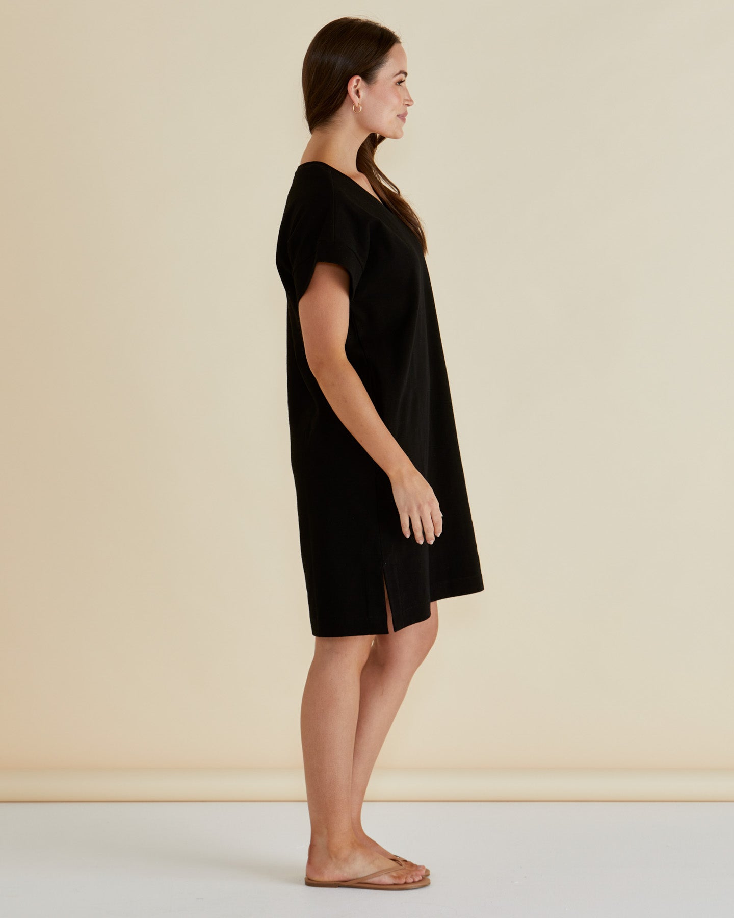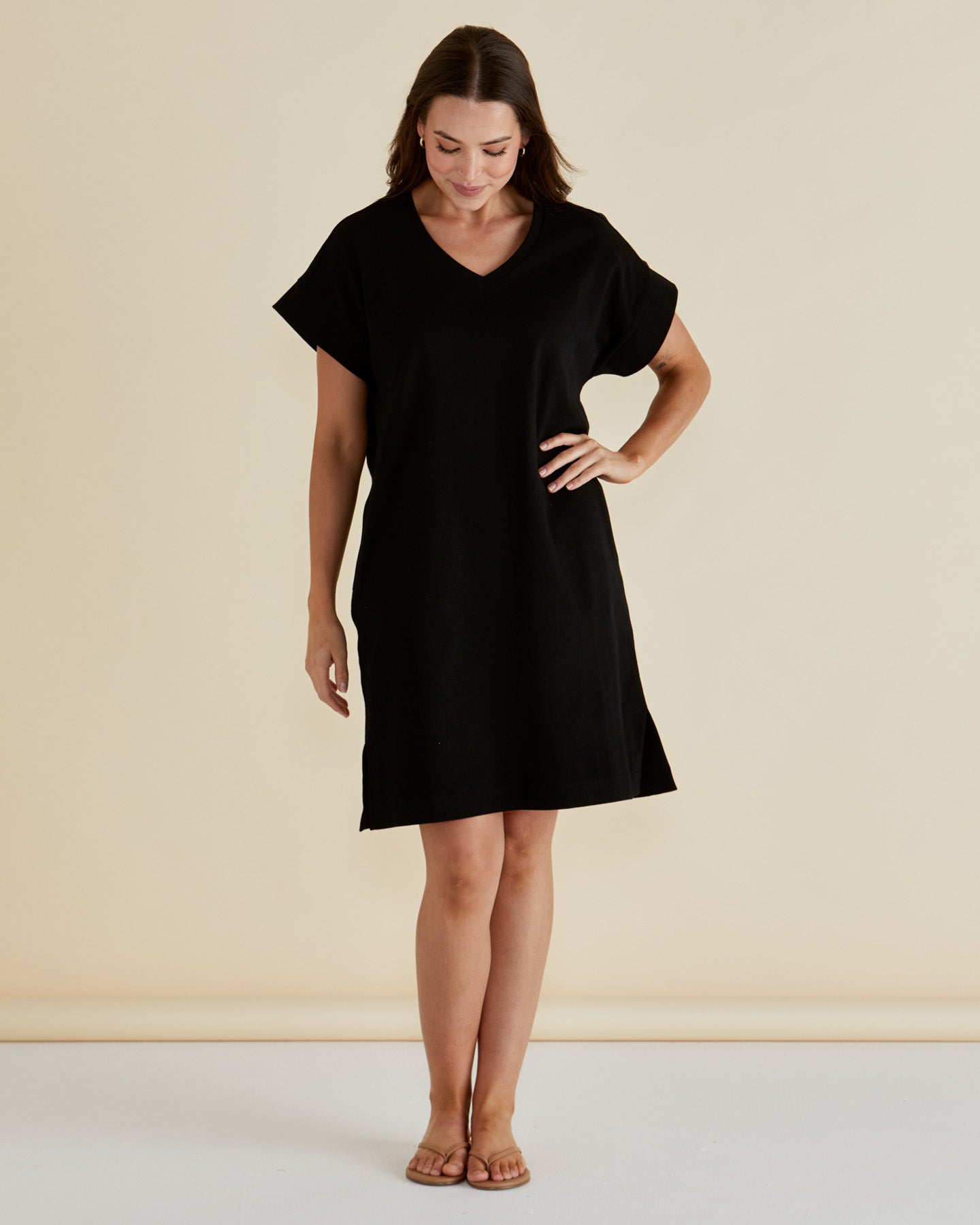 The Elise V-Neck Rib Dress is crafted for a relaxed fit with cap cuff sleeves and side splits. Its classic V-neckline and pockets create an elevated, comfortable silhouette. Perfect for effortless transeasonal elegance with a touch of sophistication.