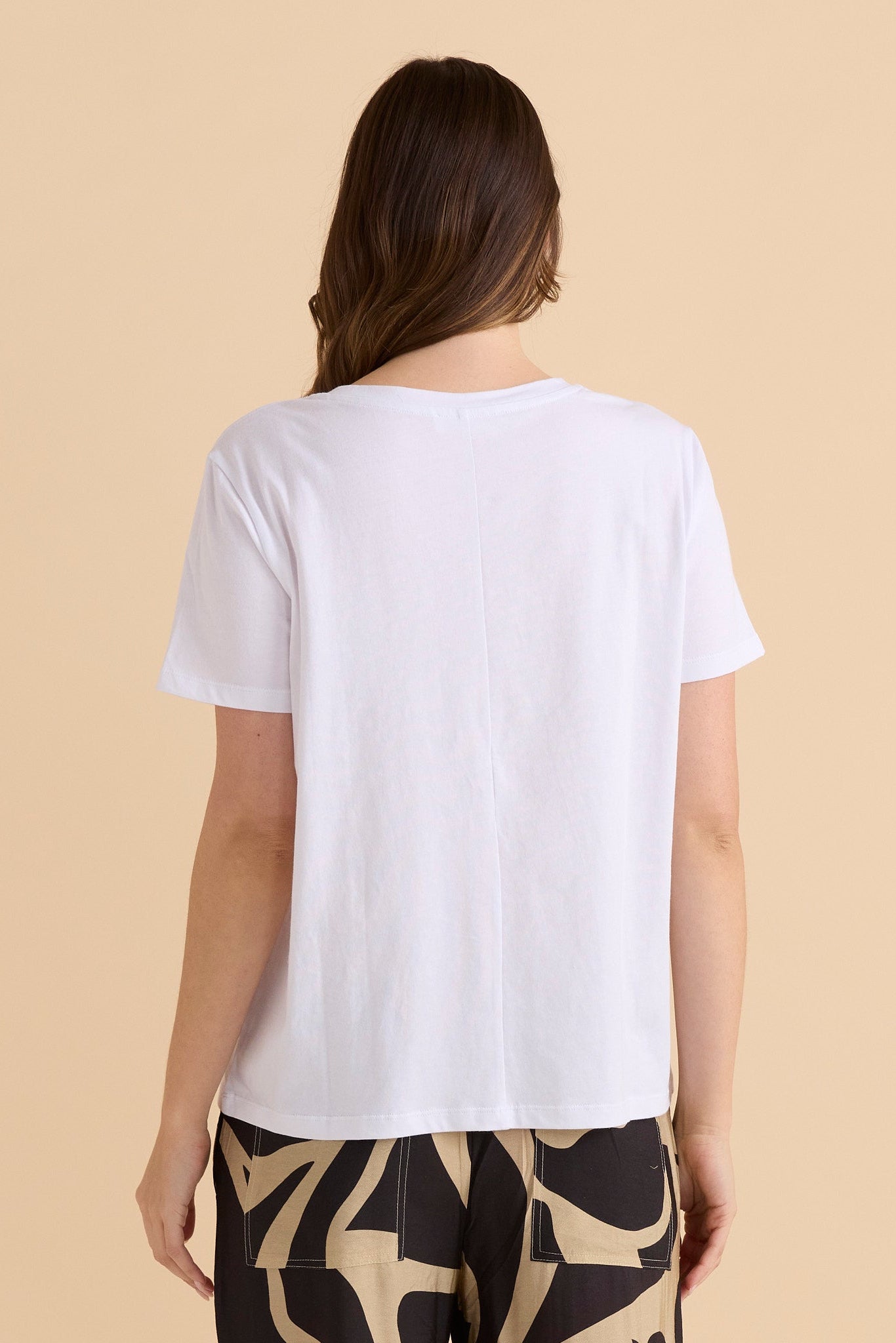 A soft cotton tee designed for effortless layering. The crew neckline and drop shoulders offer a relaxed, modern feel. Finished with a slightly high-low hem for an elevated everyday look. A comfortable essential for any wardrobe.