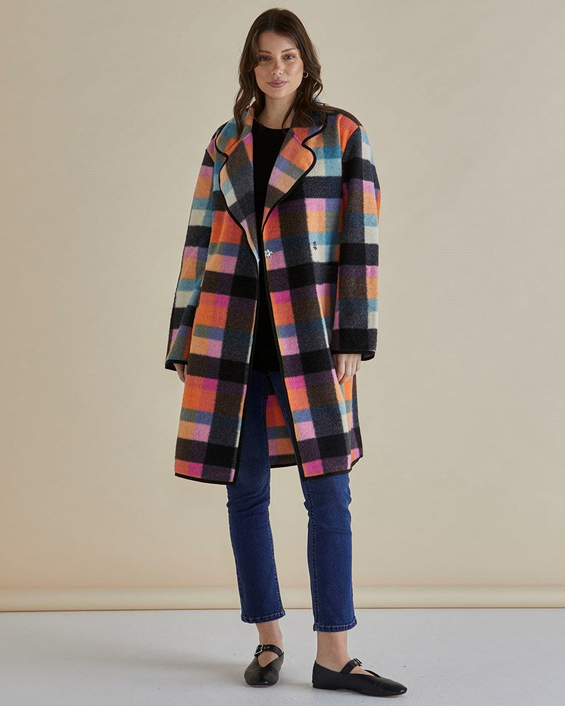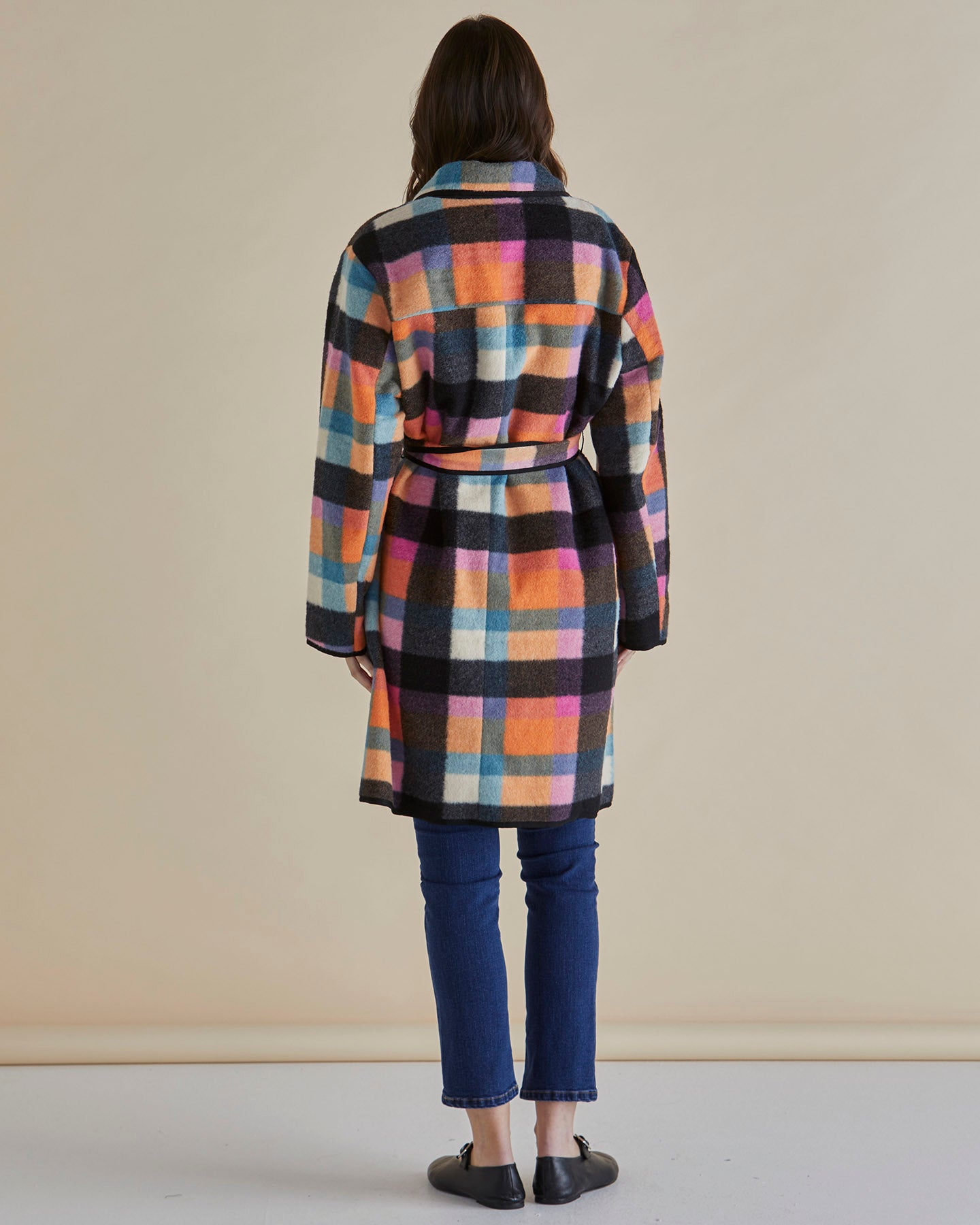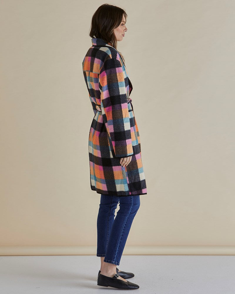 The Ellie Coat offers a classic collar and lapels with a self-fabric tie belt, front pockets, and belt loops. With a relaxed fit, it’s perfect for layering over any outfit, providing an elegant and comfortable look for any occasion.