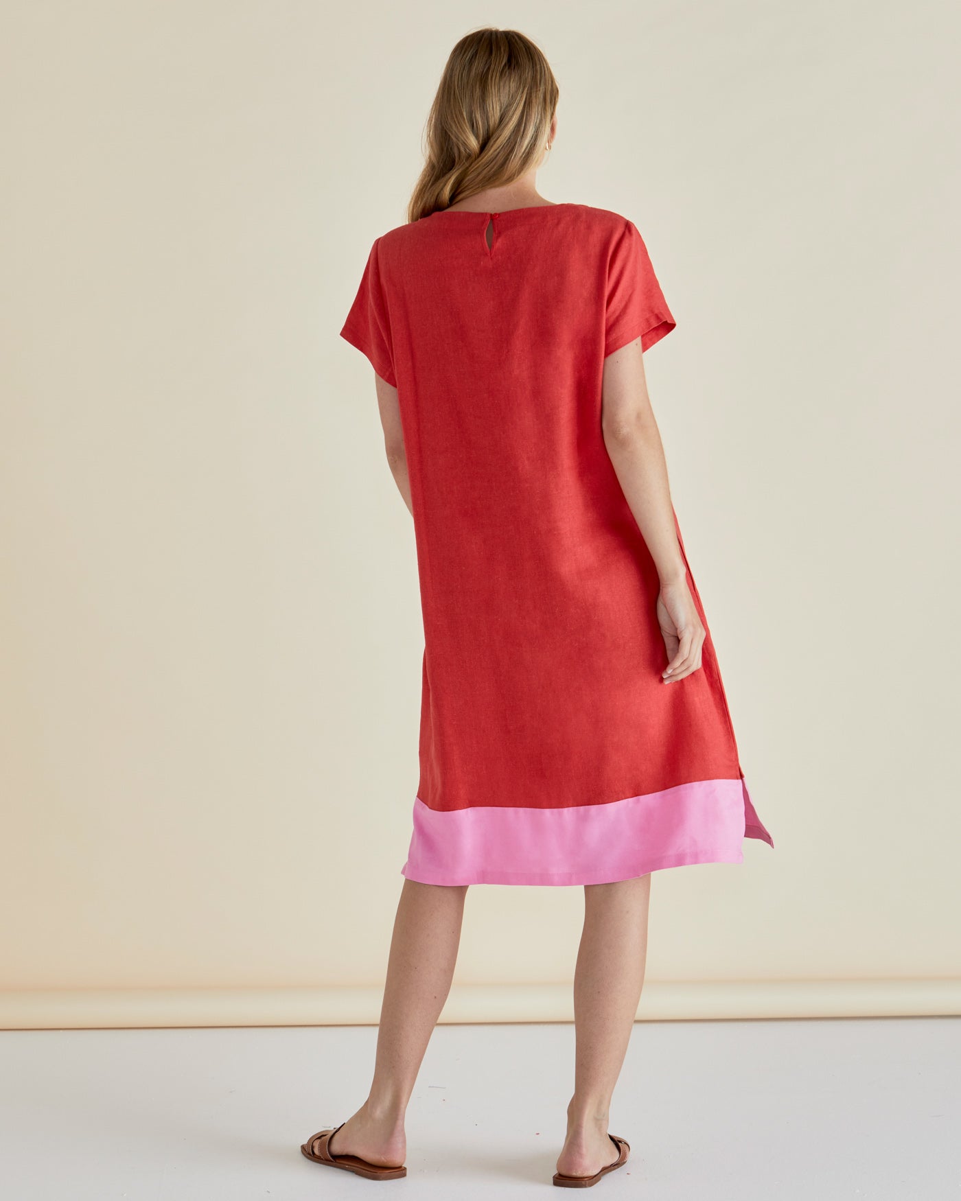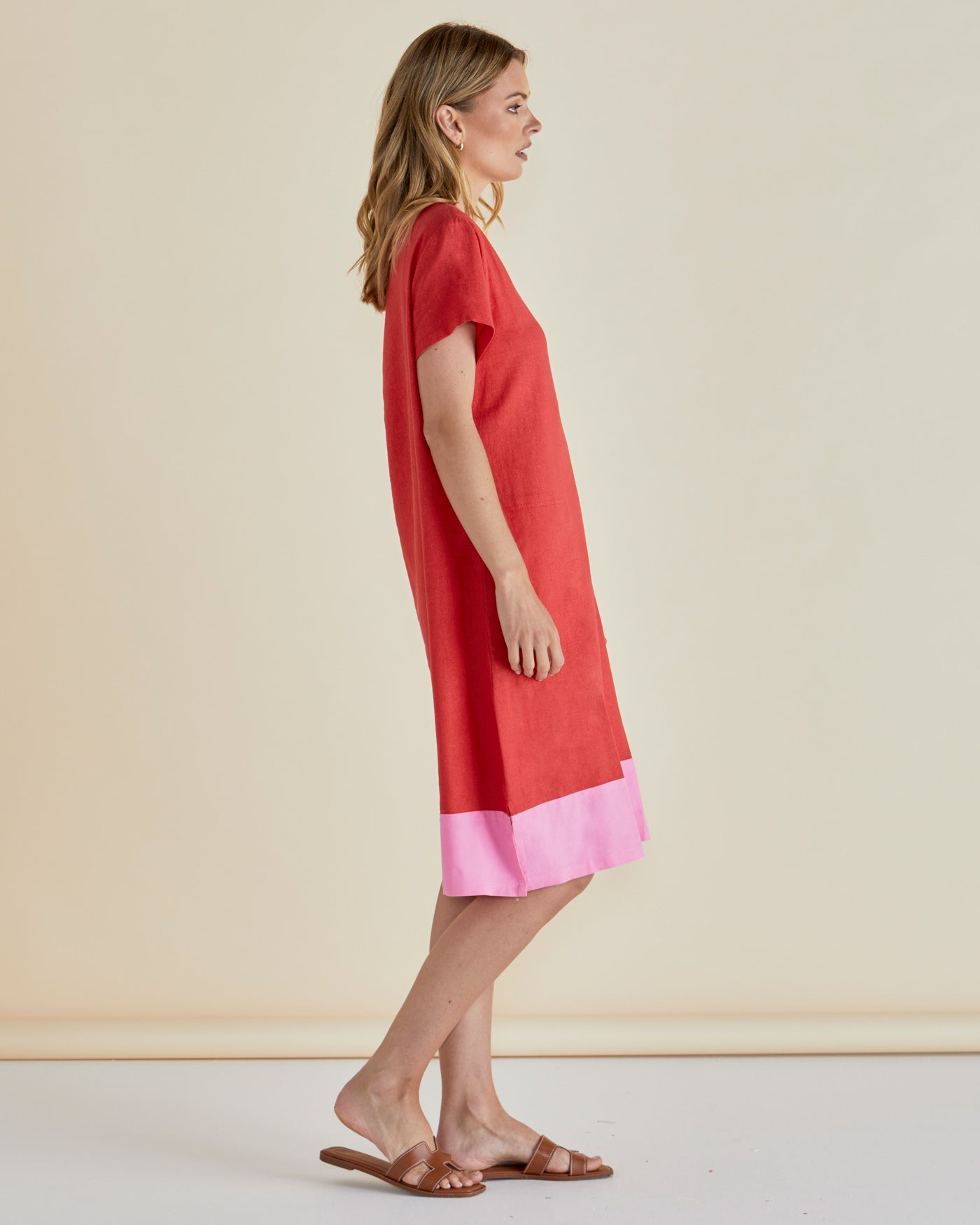 The Elwood Dress is effortless perfection! With an oversized fit, vneckline and bold contrasting stripe detail at the hem, this linen-blended dress will be your go-to look for balmy summer days.