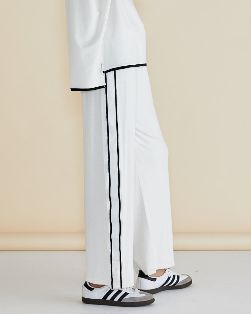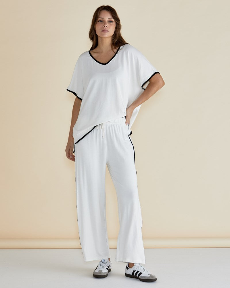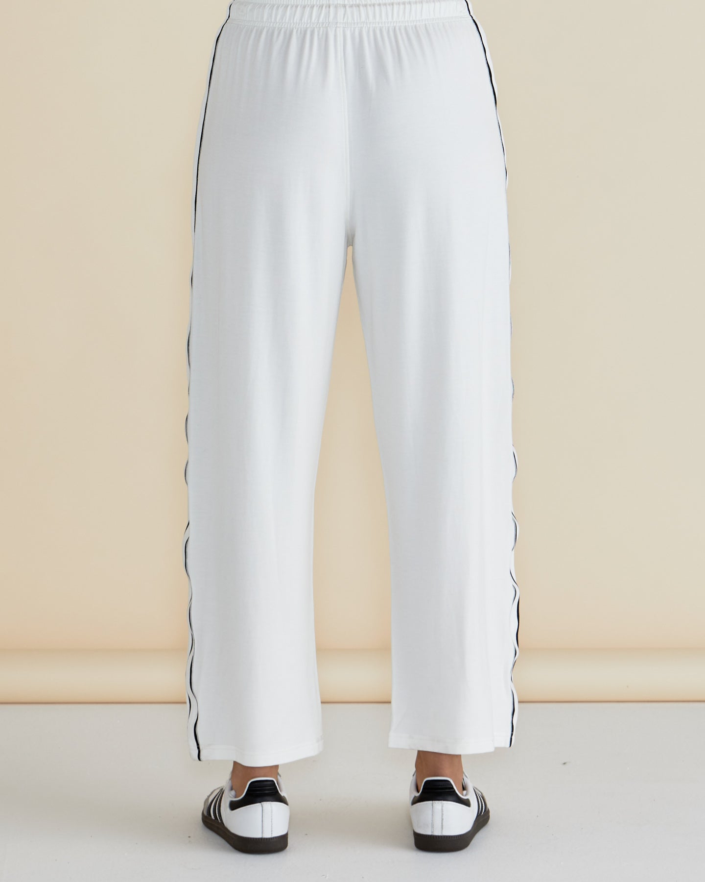 The Evelyn Wide Leg Jogger offers a relaxed yet elevated style with contrast trim detailing and an elasticated waistband. This mid-high rise fit is the perfect blend of comfort and on-trend design.