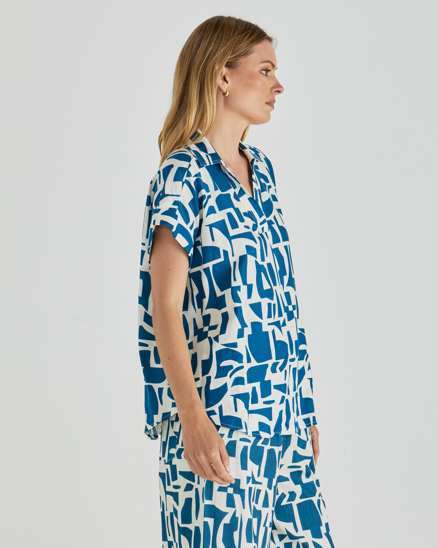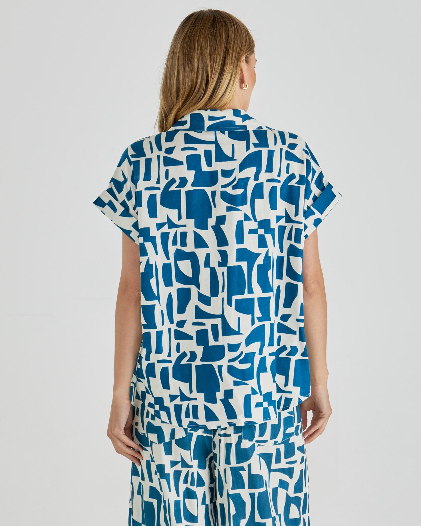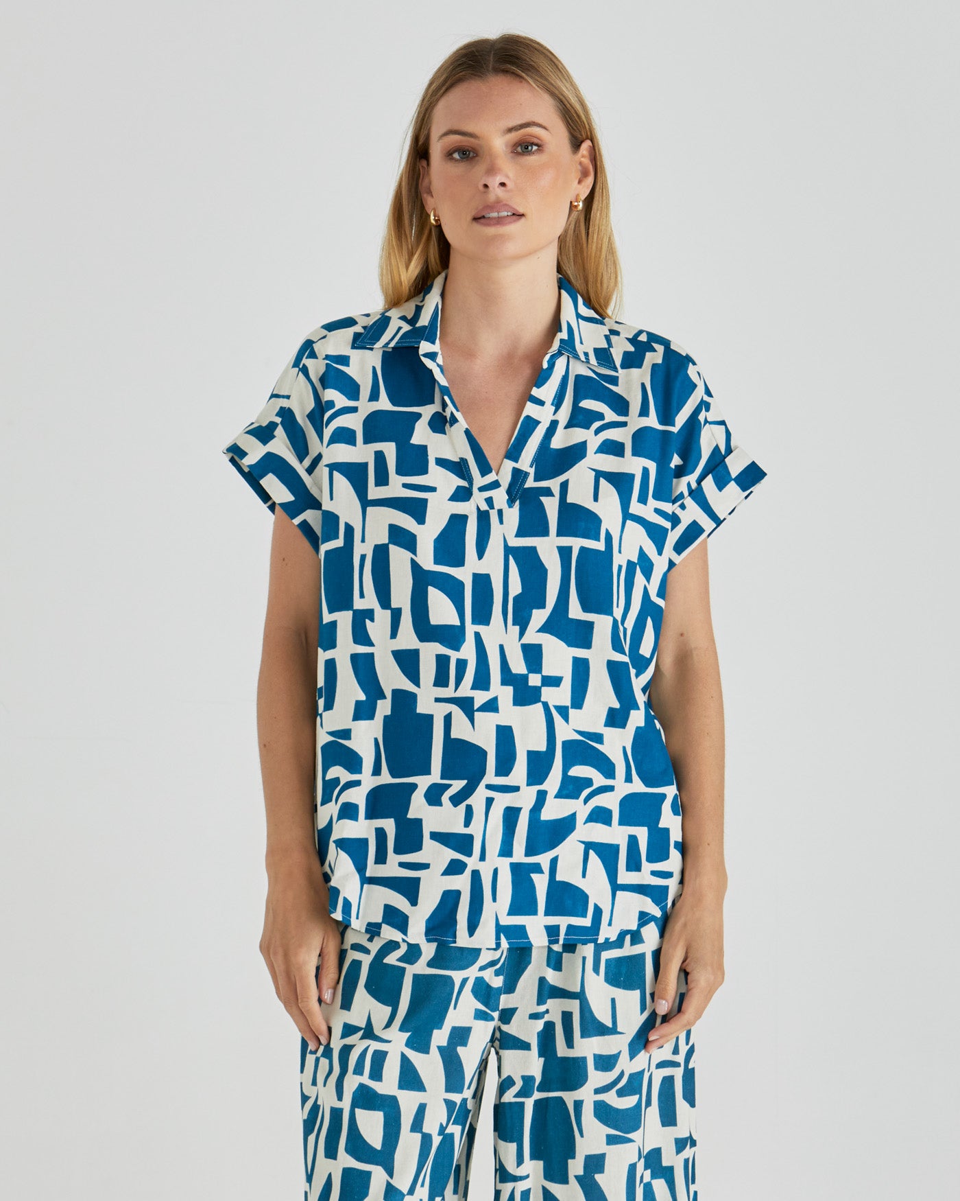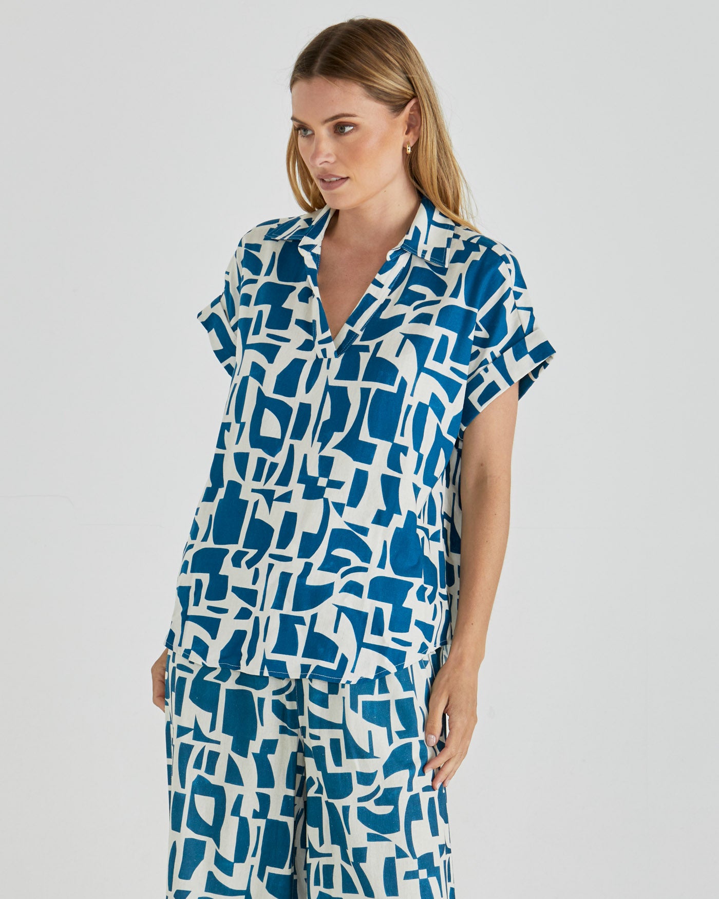 The Flores Blouse in a viscose/linen blend pairs a cuffed short sleeve with a collared neckline and front v-drop. Its curved hem provides an elevated touch, making this an essential for easy, polished style.