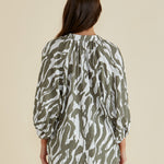 Crafted from a breathable viscose/linen blend, the Grazia Blouse features an open V-neckline with a delicate tie neck detail. Long balloon sleeves with elasticated cuffs add an elevated, classic charm. Its oversized fit offers comfortable, effortless transeasonal elegance perfect for polished styling.