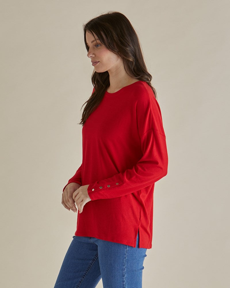 A modern twist on a wardrobe staple, the Hendrix Ribbed Long Sleeve Tee is made from a soft stretch ribbed texture for both comfort and style. The elevated snap button sleeves give it an on-trend, current feel, while the relaxed fit and side splits create an effortless silhouette that’s perfect for layering or wearing solo.