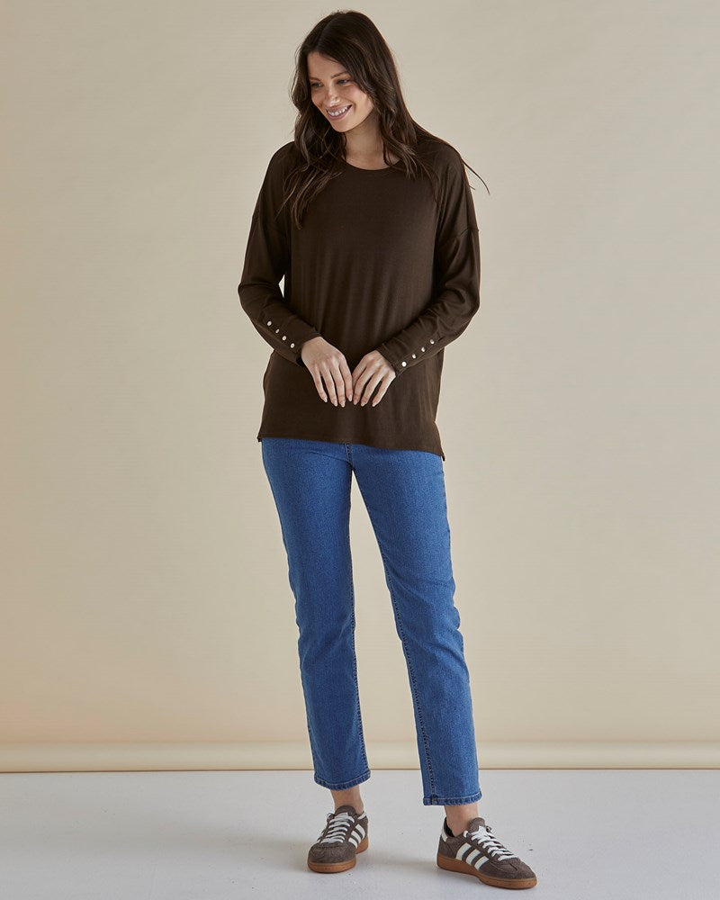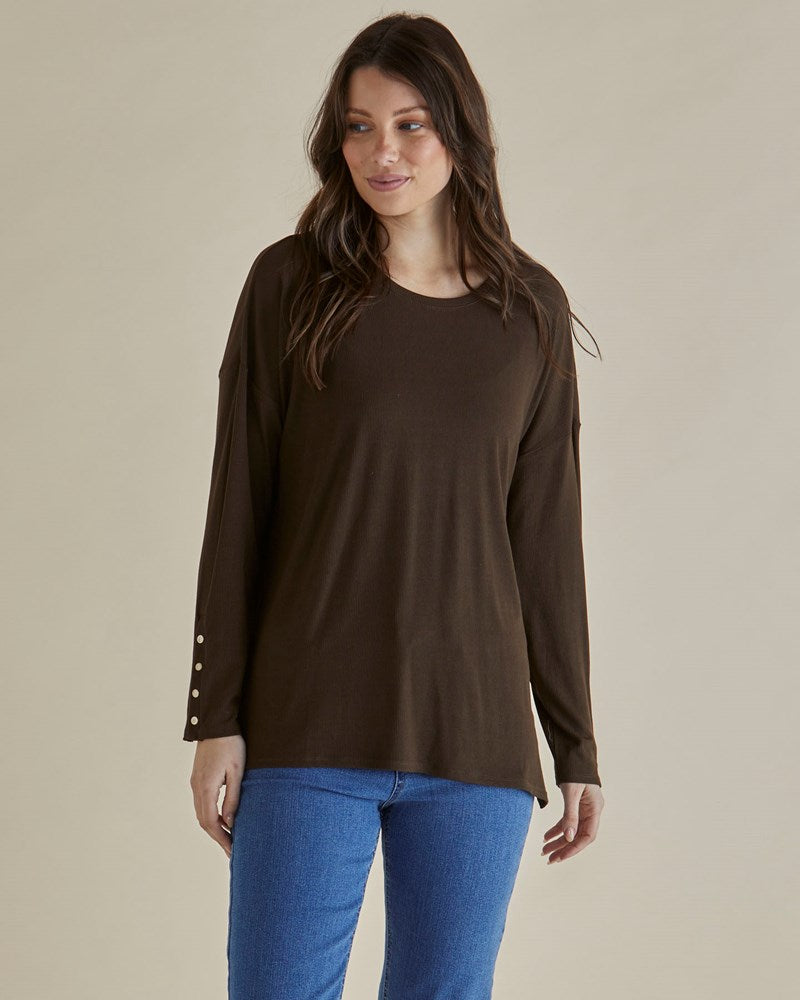 A modern twist on a wardrobe staple, the Hendrix Ribbed Long Sleeve Tee is made from a soft stretch ribbed texture for both comfort and style. The elevated snap button sleeves give it an on-trend, current feel, while the relaxed fit and side splits create an effortless silhouette that’s perfect for layering or wearing solo.