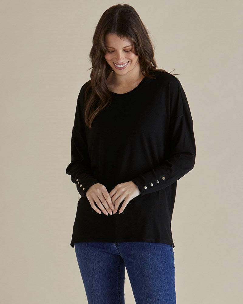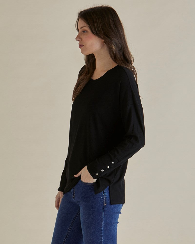 A modern twist on a wardrobe staple, the Hendrix Ribbed Long Sleeve Tee is made from a soft stretch ribbed texture for both comfort and style. The elevated snap button sleeves give it an on-trend, current feel, while the relaxed fit and side splits create an effortless silhouette that’s perfect for layering or wearing solo.