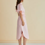 The Immie Dress combines relaxed elegance with timeless appeal. Featuring a stand collar, button-up front and elasticated waistband, it creates a flattering yet comfortable shape. The curved hem and self-fabric waist tie add soft sophistication. An effortless transeasonal piece that feels classic and elevated.