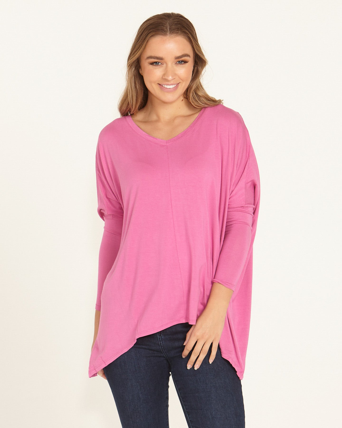 Introducing the Kyoto V-Neck Tee - your new go-to for effortless style and comfort! With its relaxed fit, flattering V-neckline, and trendy drop shoulder long sleeves, this tee is perfect for laid-back days or casual outings. The hanky hem adds a playful twist to your look, making it a fun and versatile addition to your wardrobe. Elevate your style with this must-have tee that's as comfy as it is chic!
