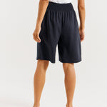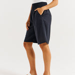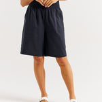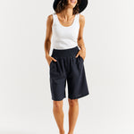 The Lee Bermuda Short in a breathable viscose/linen blend brings a refined touch with a shirred waistband and pockets. Its bermuda length makes it a polished and easy staple for warmer days.