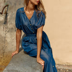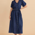A lightweight denim dress designed for comfortable elegance. The button-through front and V-neckline create a flattering classic silhouette. A removable tie shapes the waist with ease. A relaxed transeasonal favourite.
