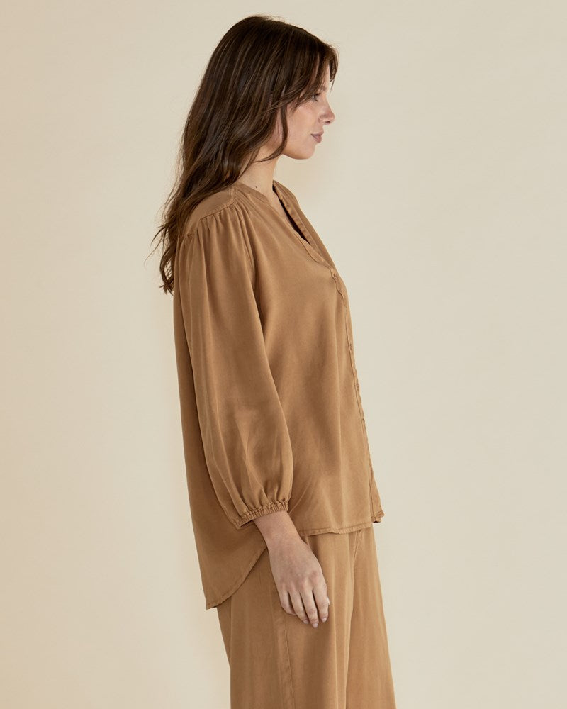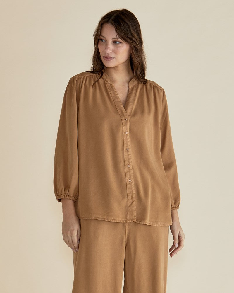The London Lyocell Blouse brings contemporary style with its stand collar, button-up front, and balloon sleeves. The high-low hem adds an on-trend touch to this relaxed yet polished piece.