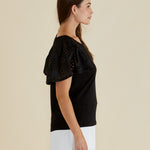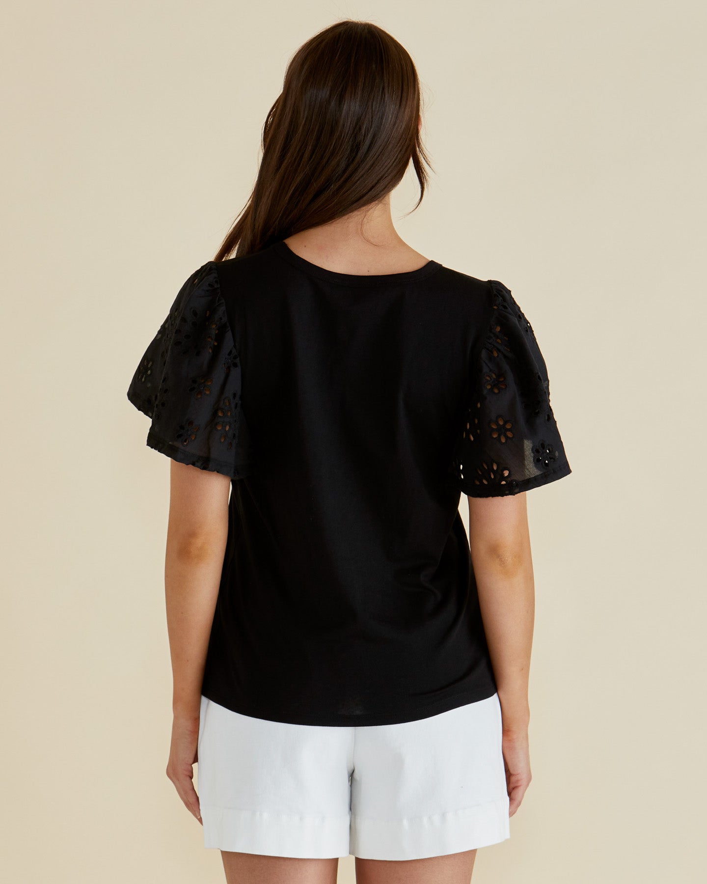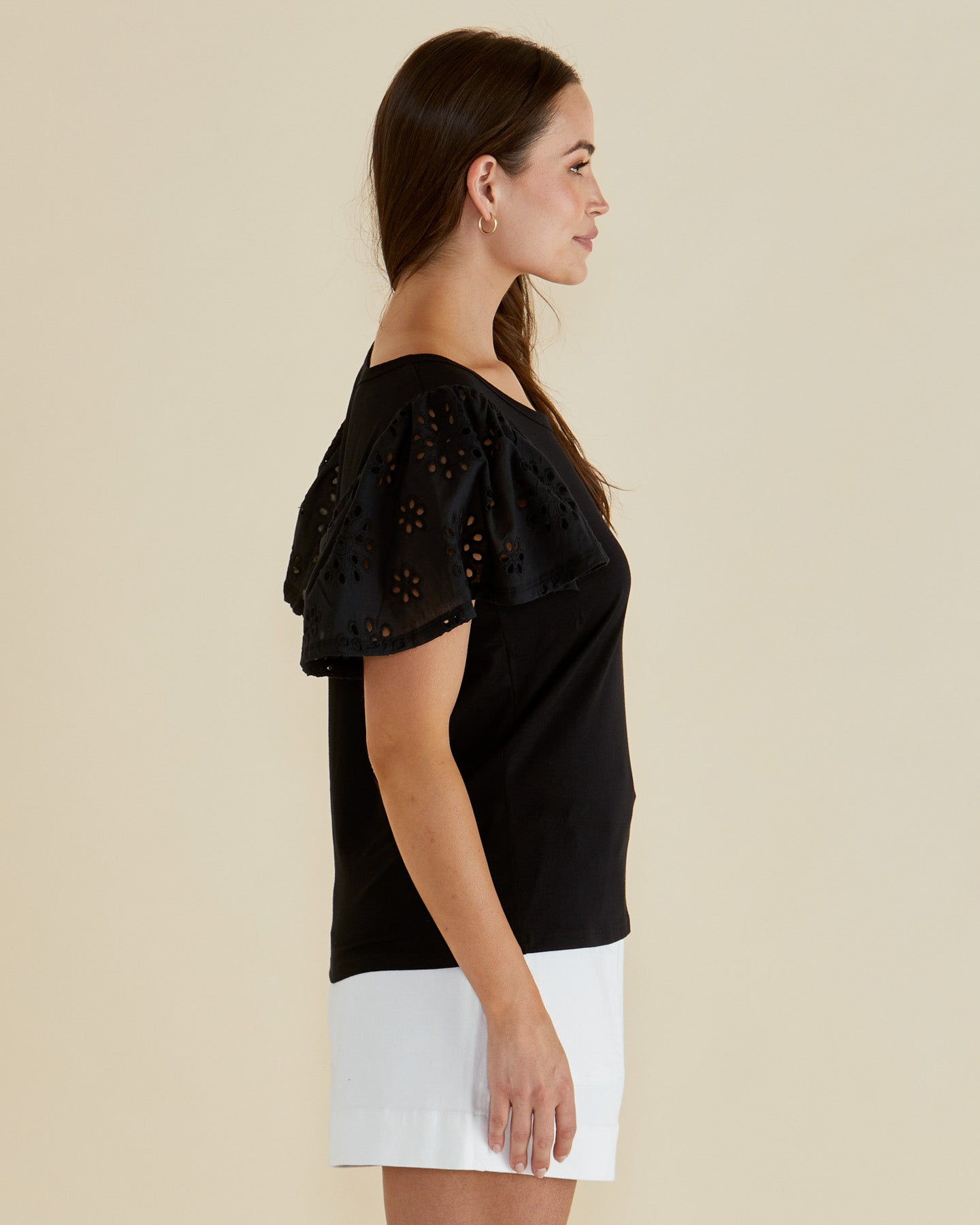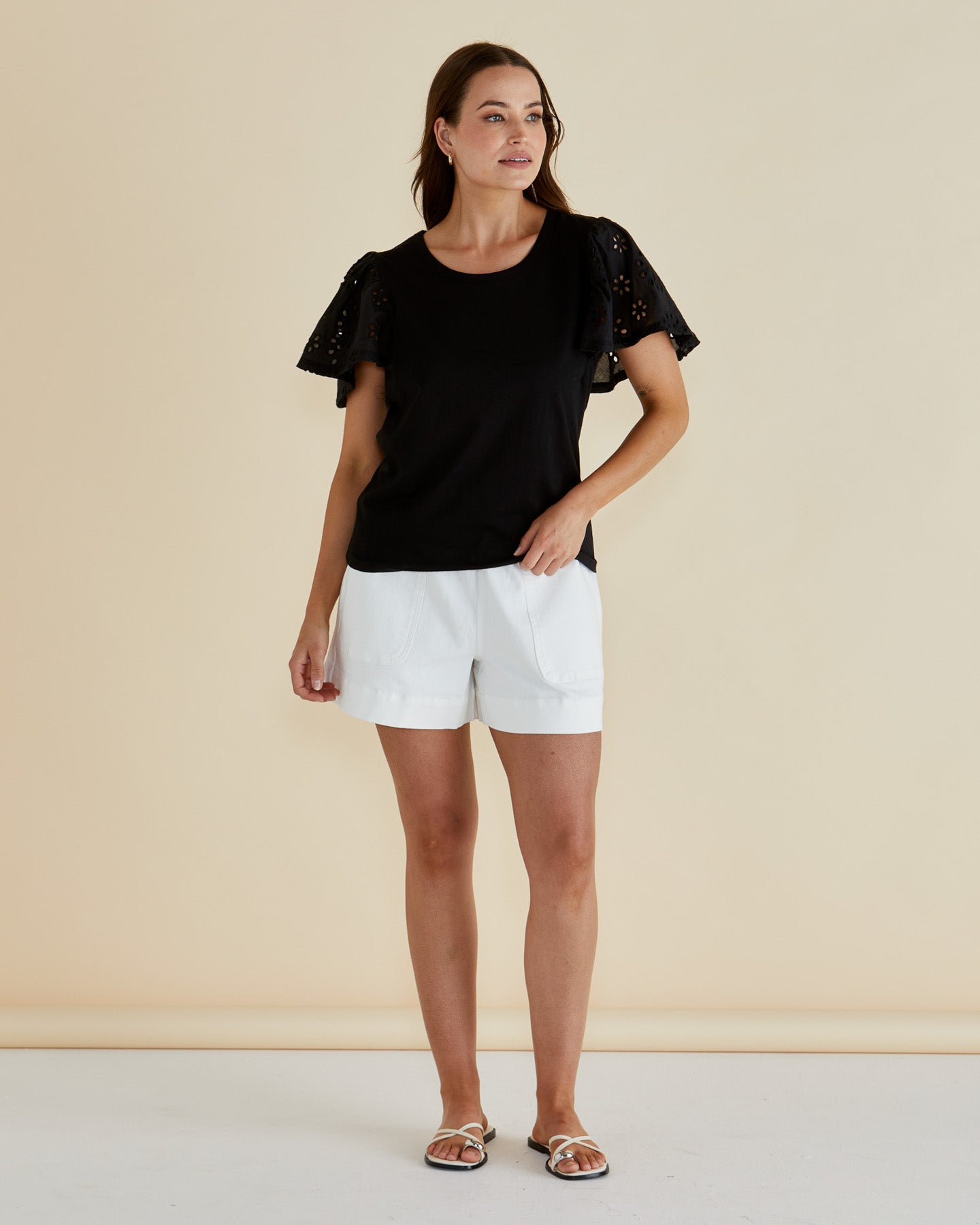 The Lottie Embroidered Tee combines playful sophistication with a classic cotton jersey fabric. Featuring short flutter Broderie anglaise sleeves and a relaxed fit, it offers effortless comfort and an elevated silhouette. A perfect transeasonal piece that feels easy and chic.