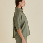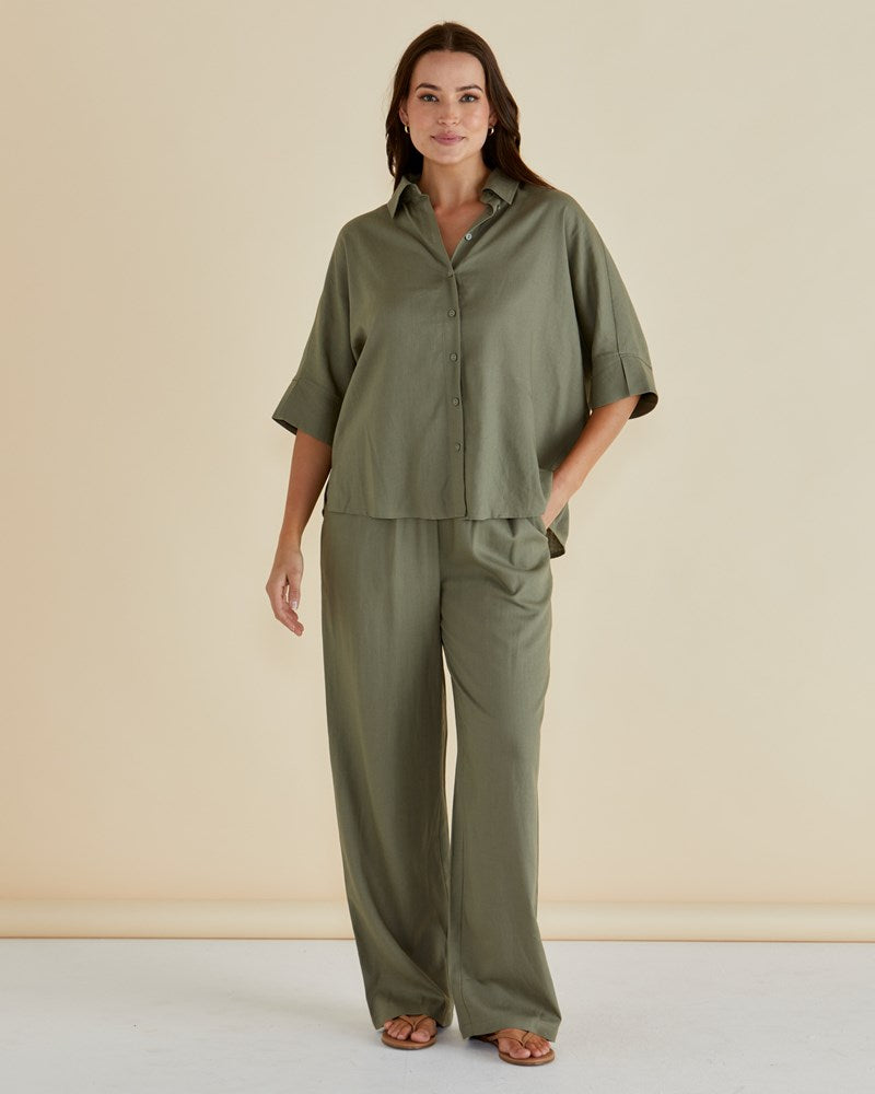 The Lynwood Linen Shirt is an oversized classic crafted from a breathable viscose/linen blend. Button-up front with collar and extended split cuffs elevate this relaxed fit essential. The high-low curved hem adds effortless style, making it a perfect transeasonal layering piece that is comfortable and polished.