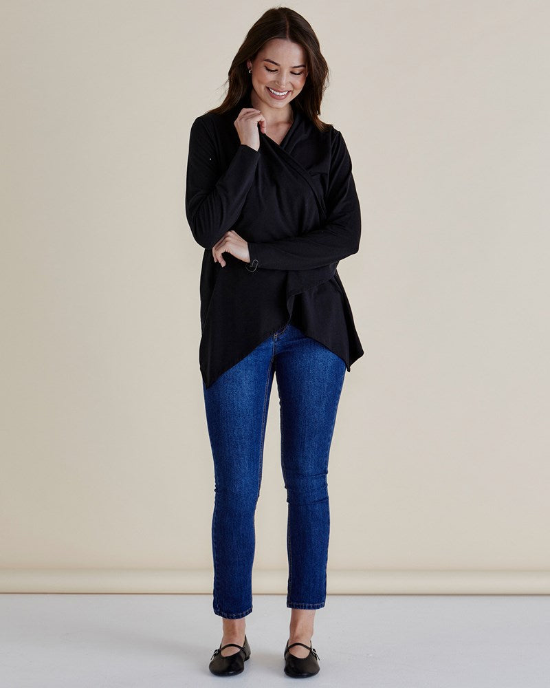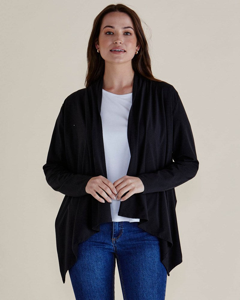 Elevate your layering with the Maeve Bamboo Cardigan, designed in stretch viscose bamboo jersey with a shawl collar and wrap feature. This relaxed fit jacket offers a timeless, refined look that seamlessly transitions through seasons, providing both comfort and sophisticated polish.