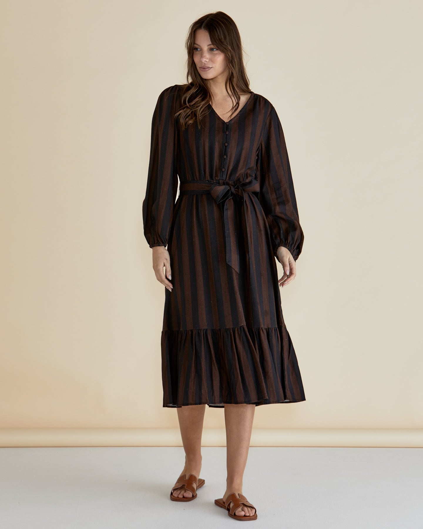 Featuring a button-up front and a flattering V-neckline, the Melissa Dress is accented with an elasticated cuff and self-tie waist for an easy, polished look. Its relaxed fit ensures all-day comfort with a touch of sophistication.