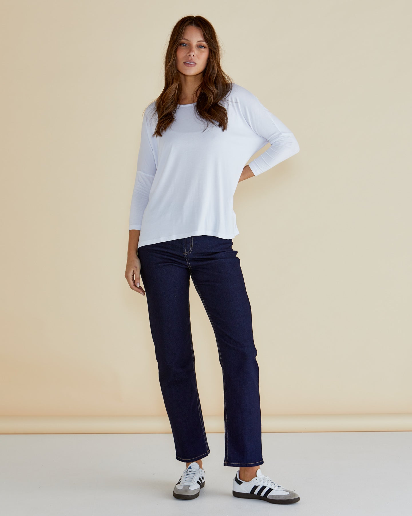 The Milan 3/4 Sleeve Top is a timeless mix-and-match staple available year-round in our Essentials collection. Featuring a relaxed drape fit and scoop neck, this versatile top is perfect for both work and play, offering effortless style and comfort.