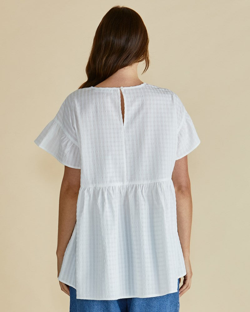 The Poppy Blouse is an elevated essential with soft, feminine details. Featuring a round neckline, frilled short sleeves and subtle gathering under the bust, it offers a flattering, relaxed silhouette. The back button closure adds a refined finish. A classic transeasonal piece that pairs effortlessly with your wardrobe favourites.