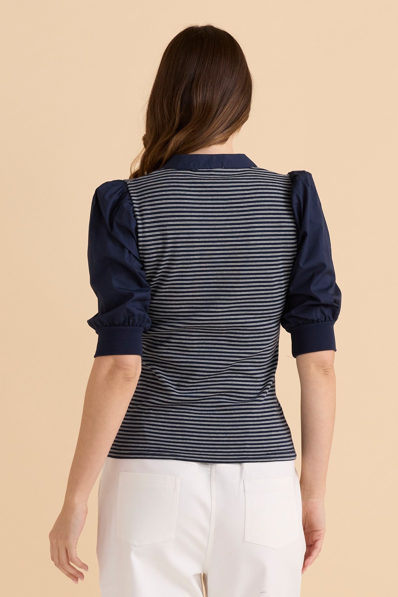 A refined everyday top featuring a soft rib body and woven puff sleeves. The button-up henley neckline adds a classic touch. Comfortable stretch ensures easy movement. A simple style with elevated charm.