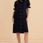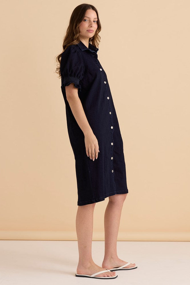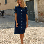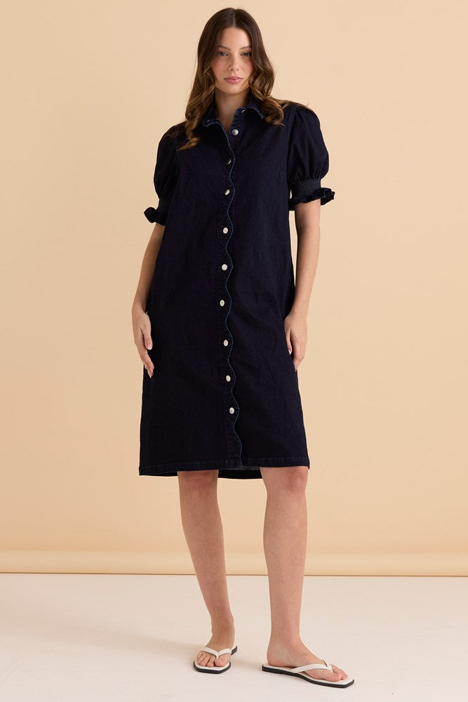 Crafted from soft denim with a feminine everyday feel. The scalloped placket and puff sleeves add an elegant touch. An easy above-knee length keeps it comfortable and flattering. A classic silhouette you can wear all season long.