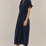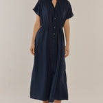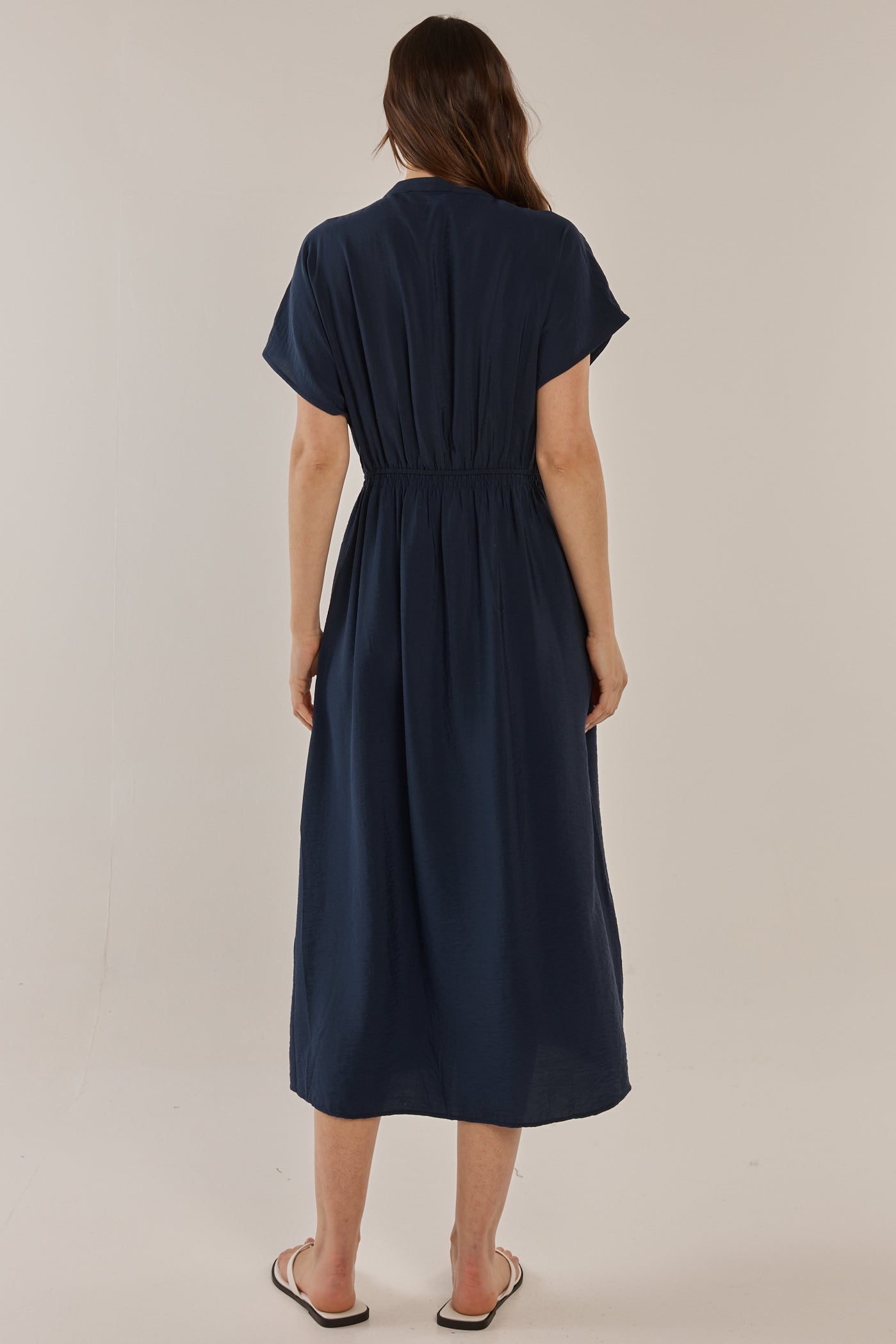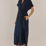 Crafted from a viscose blend, the Simone Dress offers a classic stand collar with V-neck button-up opening. Its comfortable elasticated waistband and cap sleeves create an elevated yet easy fit. A sophisticated dress designed for effortless transeasonal wear.