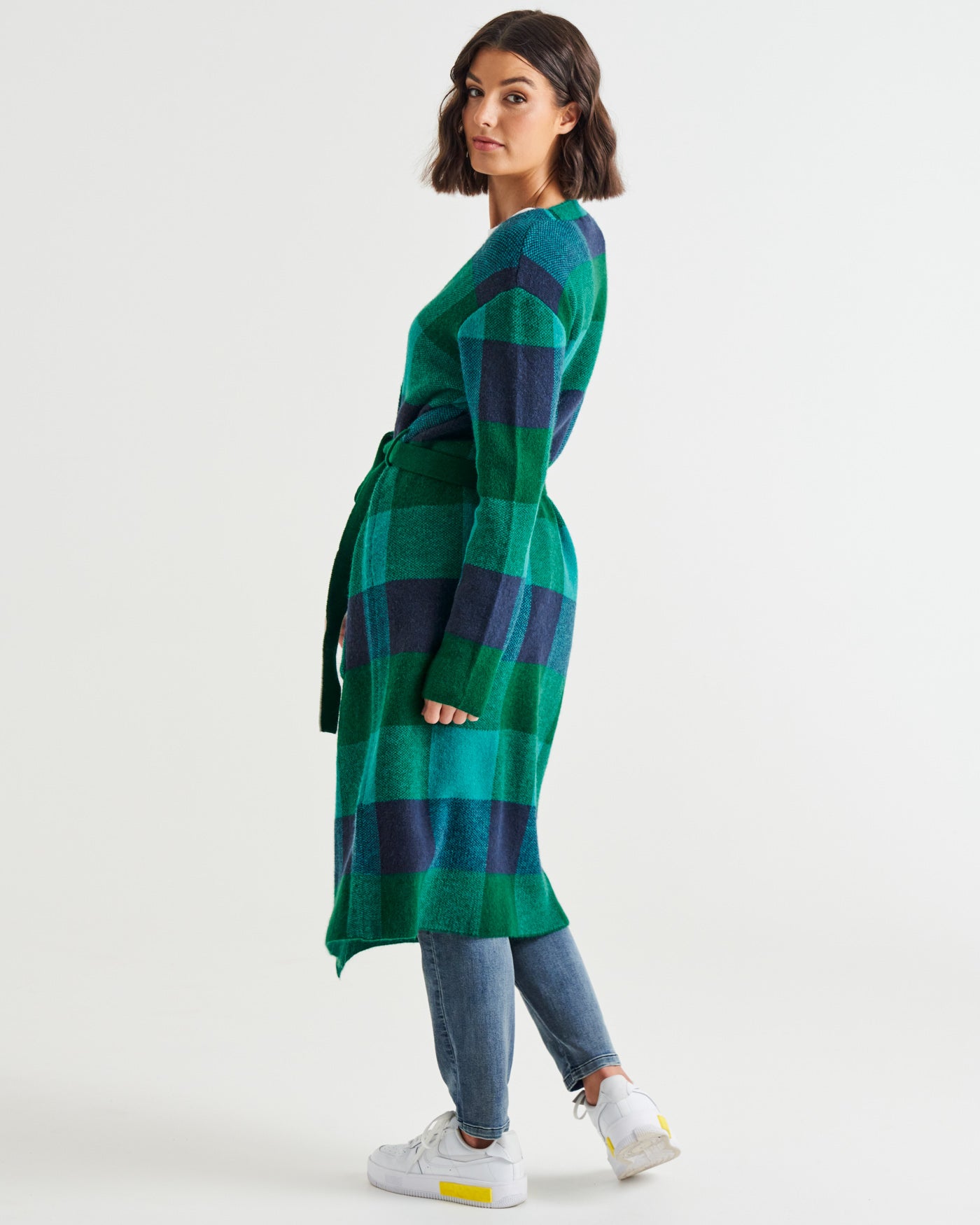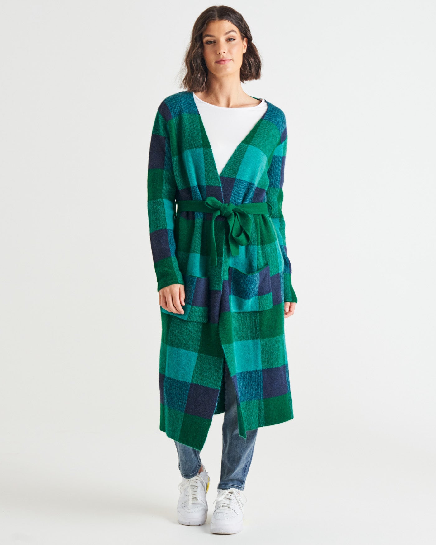 Swift Wraparound Oversized Tie Waist Cardigan - Green/Blue Check