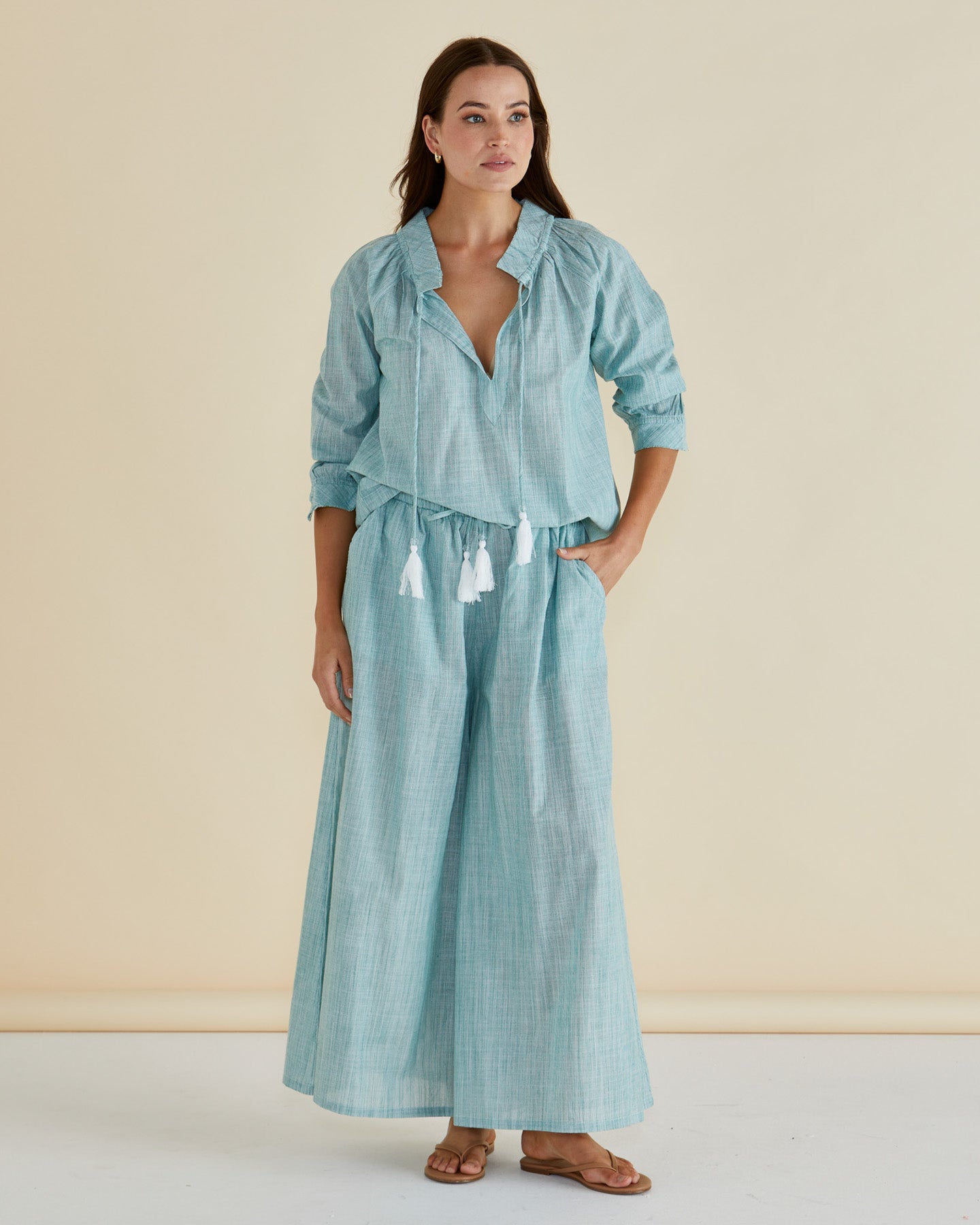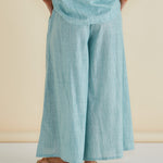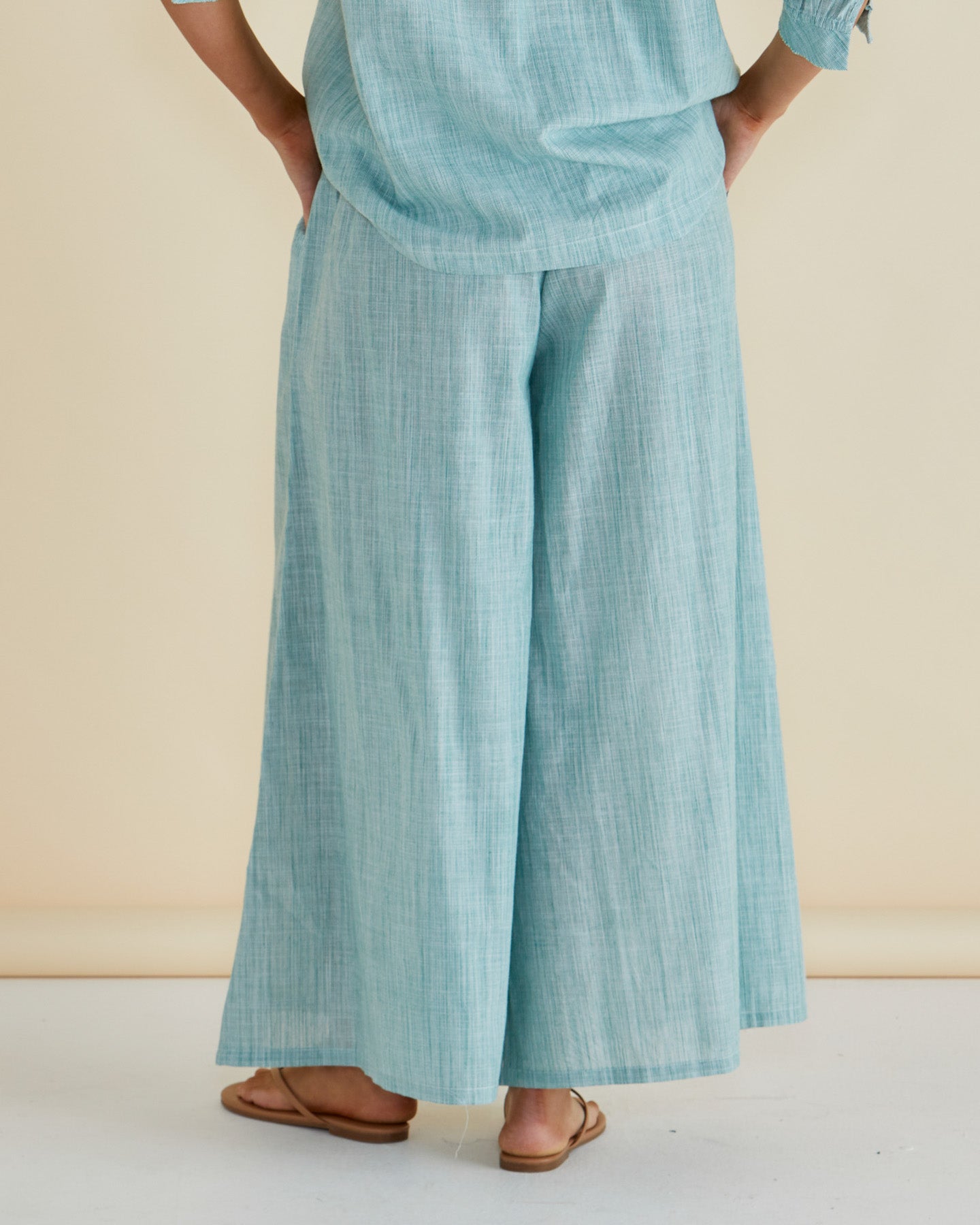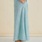The Tatum Wide Leg Pant features handwoven cotton fabric with an elasticated waistband and wide palazzo leg. Practical pockets and mid-high rise create an elevated, comfortable silhouette. A classic, easy-to-wear pant ideal for transeasonal wardrobes.