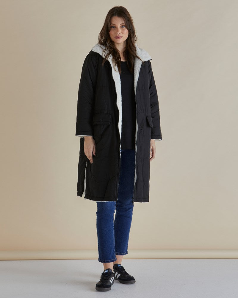 The Valkyrie Puffer Jacket features a shawl collar and long length, finishing just above the knee. The side splits and relaxed fit offer an effortlessly chic look, while the lining provides warmth and comfort, making it perfect for colder days.