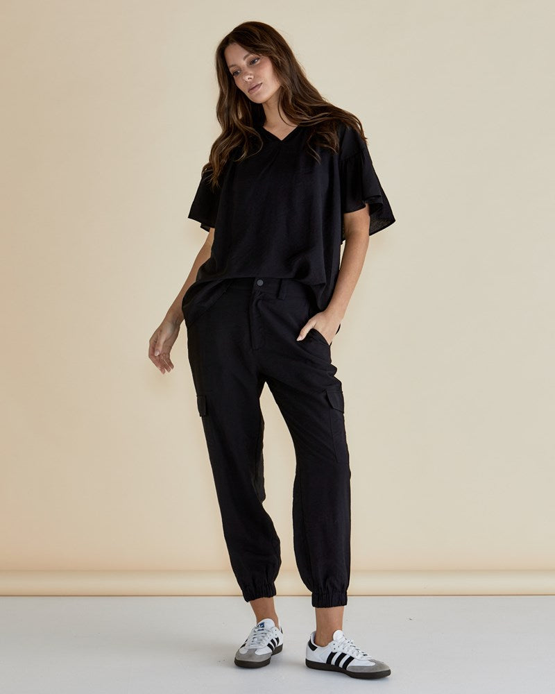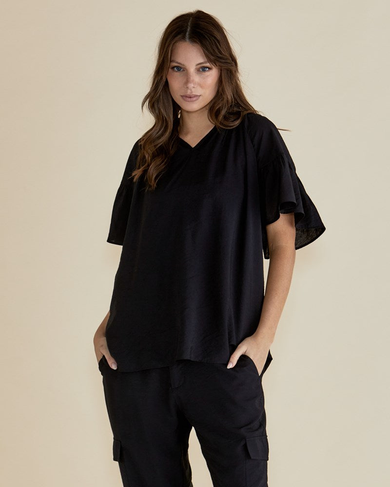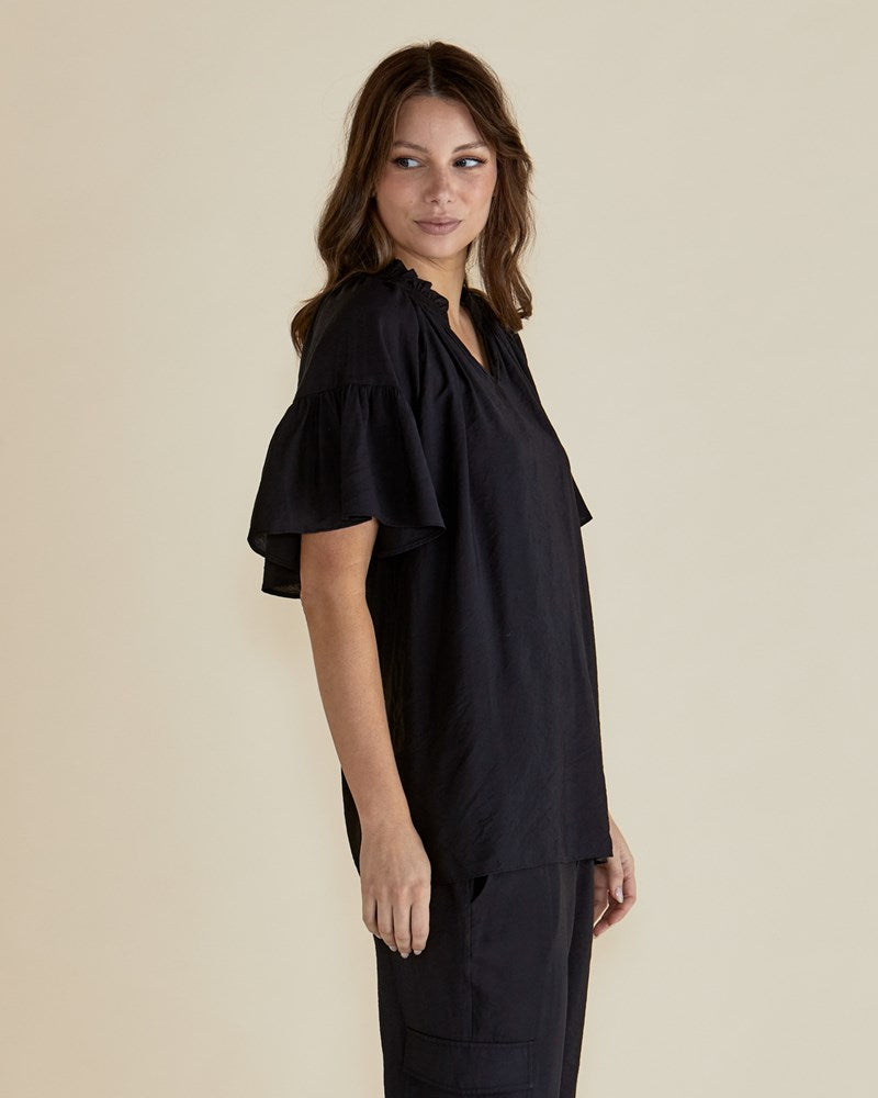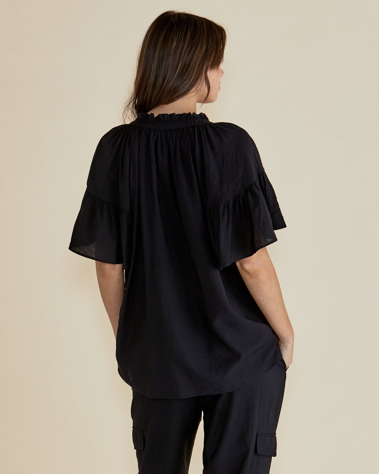 The Vivienne Blouse exudes effortless charm with its shirred mandarin collar, flutter sleeves, and relaxed drape. Raglan shoulder panels add a subtle yet refined detail to this chic piece.