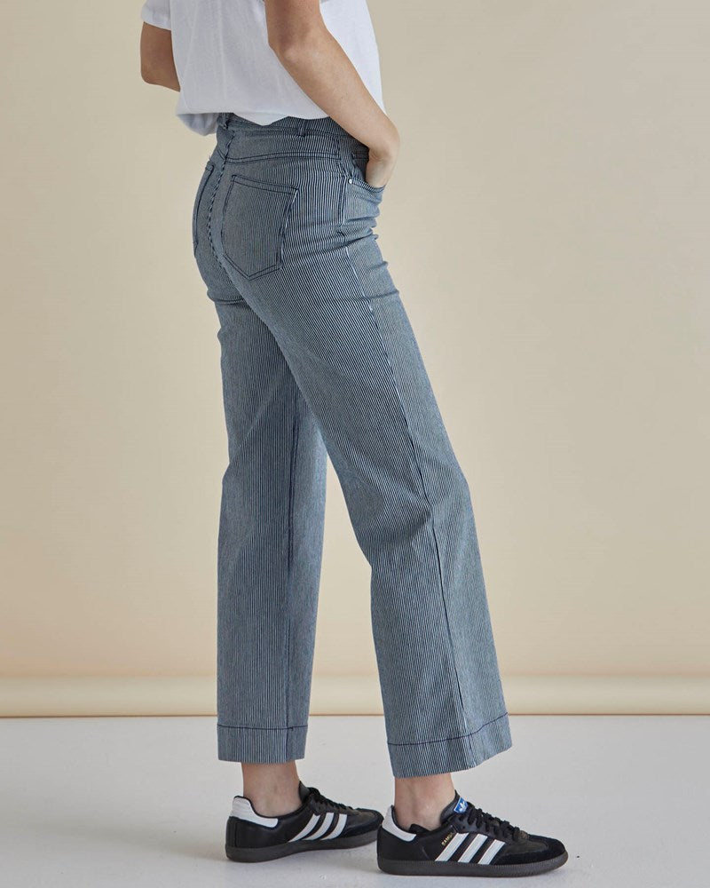 The Willow Pinstripe Wide Leg pant offers a sophisticated yet relaxed look. With its zip and button fly front, classic 5-pocket detailing, and wide-leg fit, these pants elevate your casual wear with effortless chic. Ideal for warmer months or layered for cooler days.
