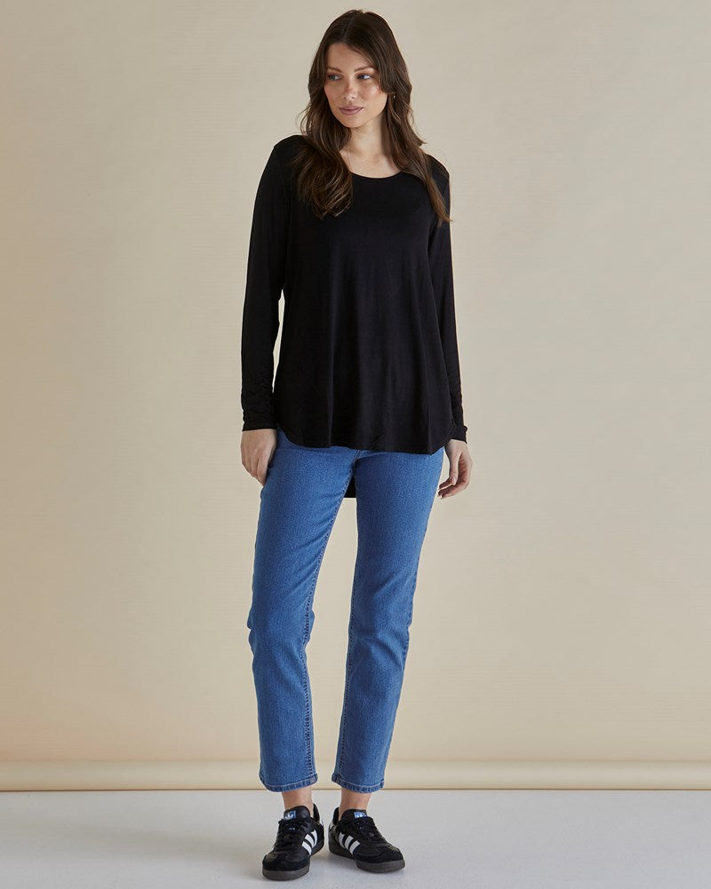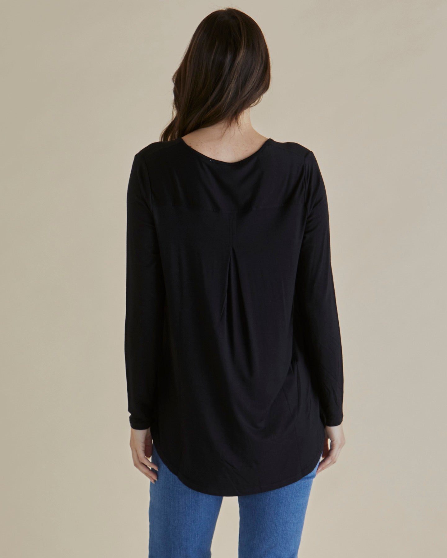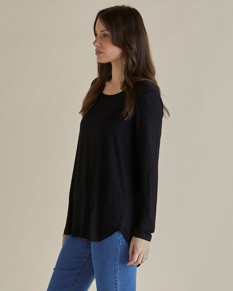 Made from soft stretch bamboo jersey, the Yasmin Long Sleeve Top features a scoop neckline and back yoke pleat detail for added sophistication. This relaxed fit piece is ideal for layering or wearing solo, offering an elegant yet comfortable look for any occasion.
