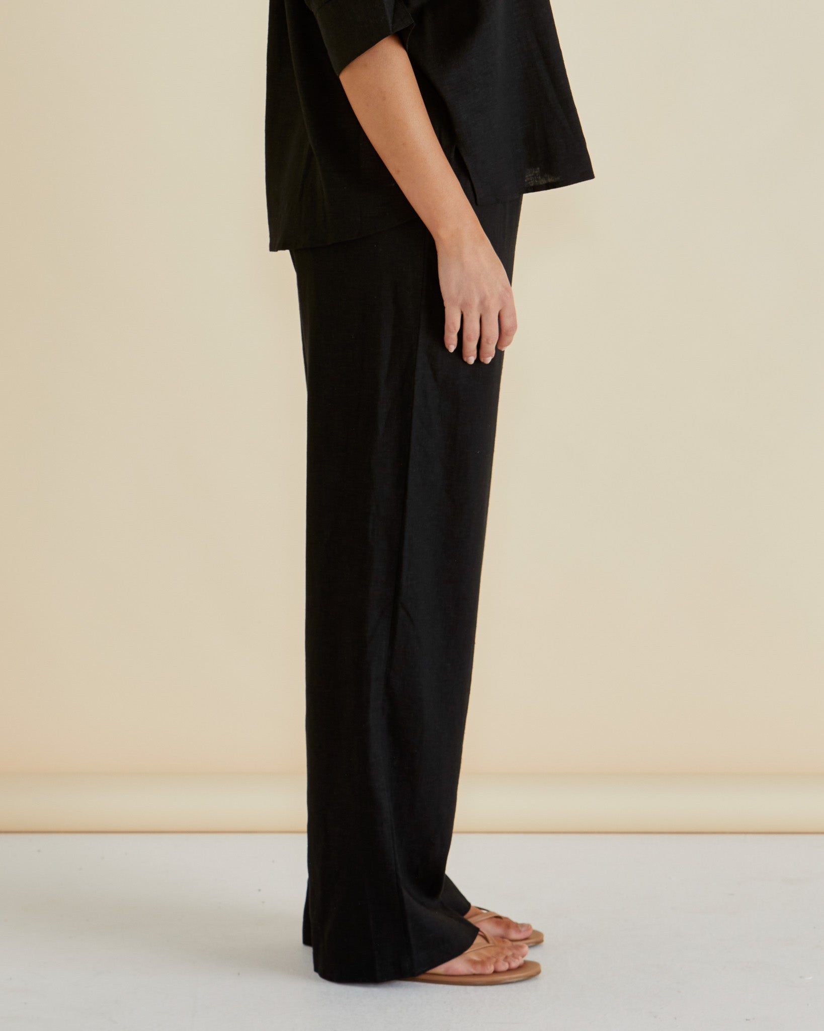 The Zaza Relax Pant is crafted from breathable viscose/linen blend fabric with an elasticated waistband and drawstring for an easy fit. Its wide leg and pockets create a sophisticated silhouette perfect for transeasonal wear. Comfortable and elevated, this pant is a timeless wardrobe essential.